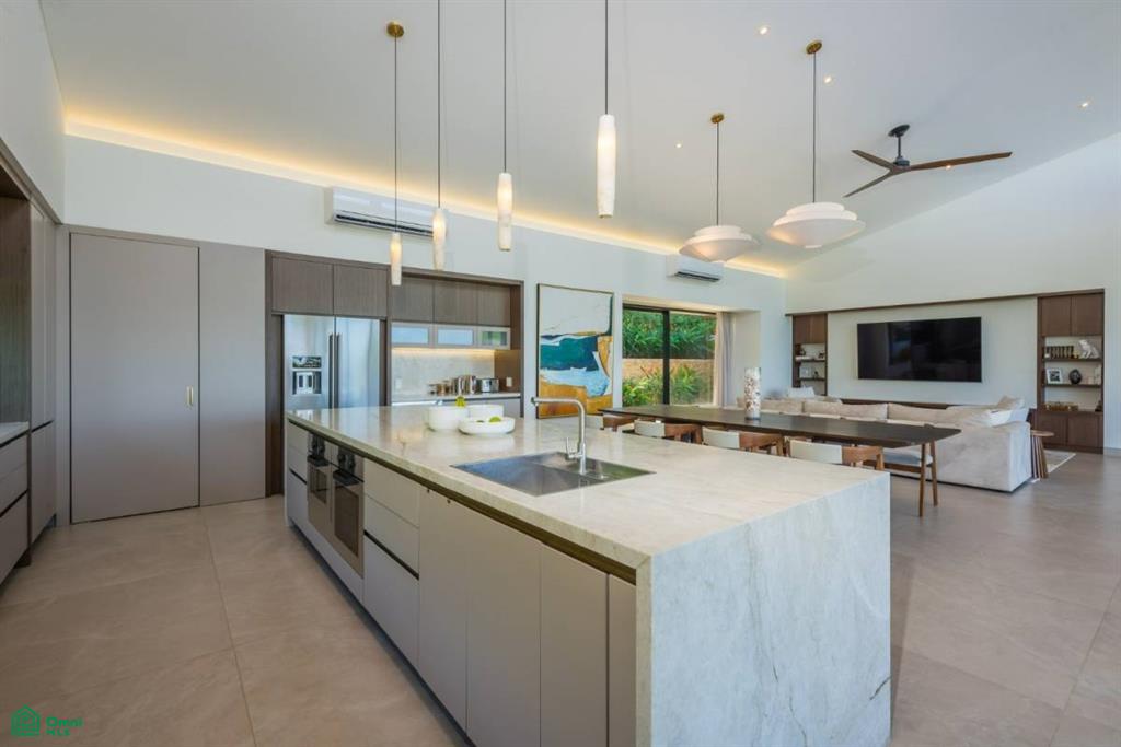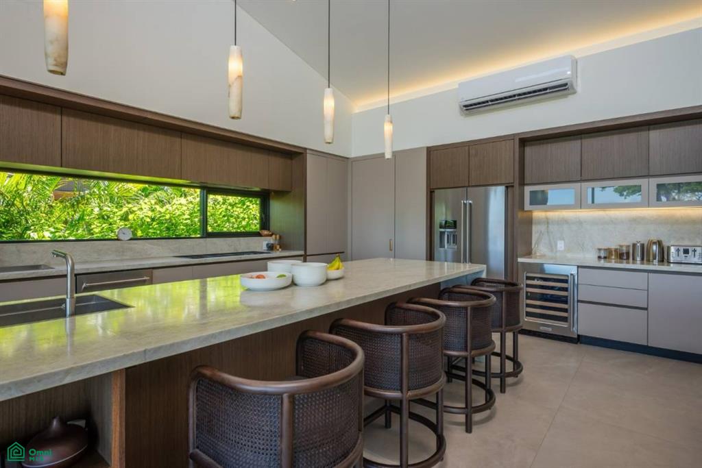 The gourmet kitchen features sleek contemporary two-toned flat cabinetry, a spacious natural stone island with bar seating, premium appliances, and gorgeous views of the ocean and surrounding greenery.