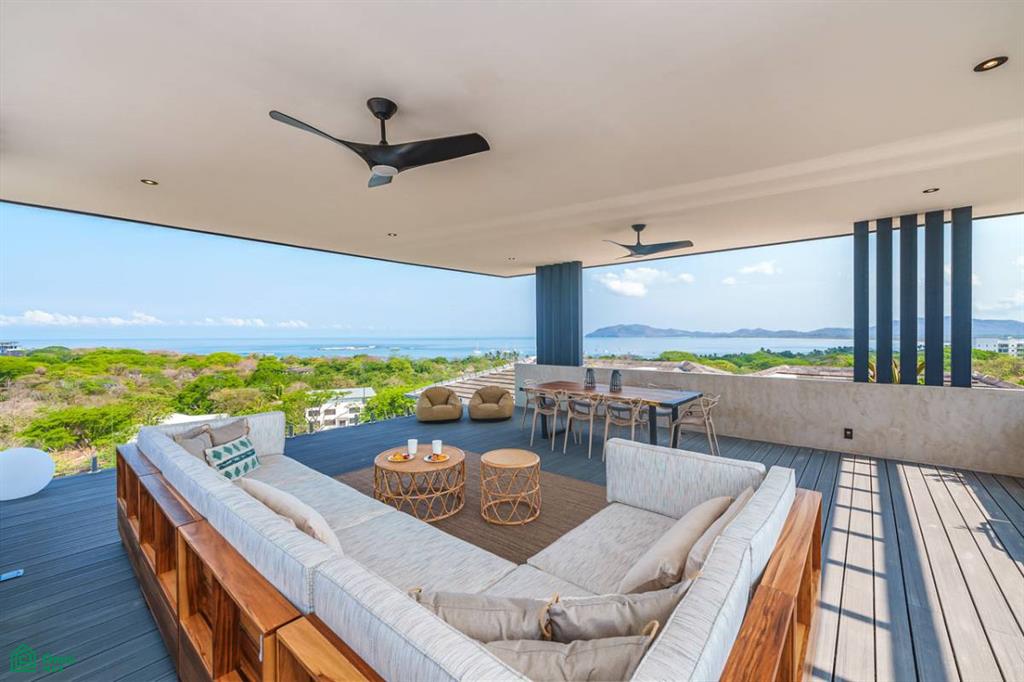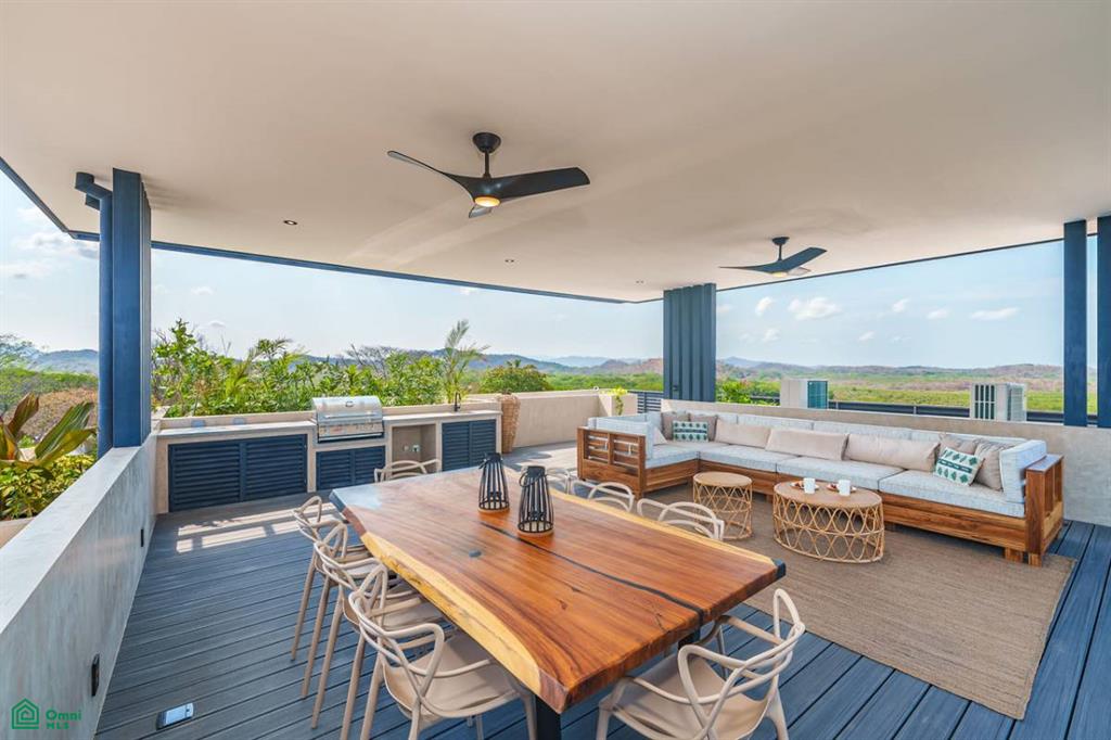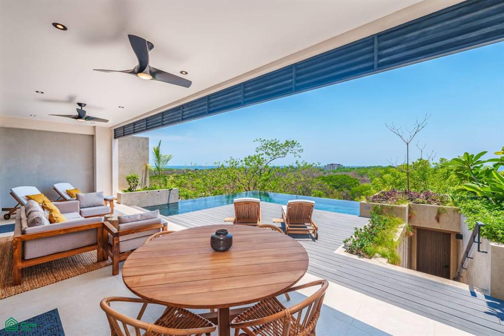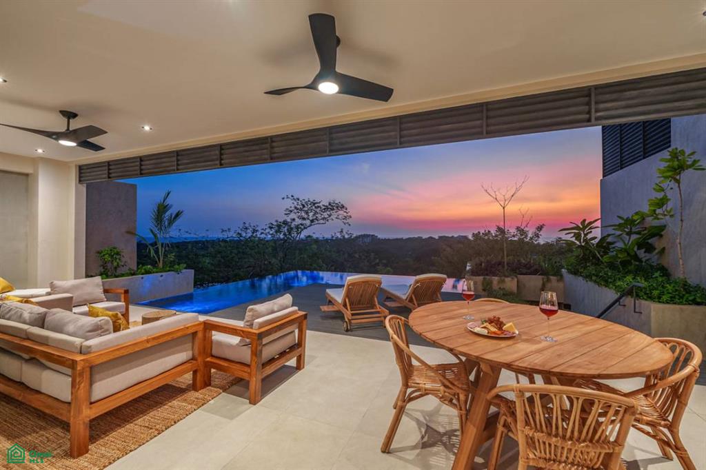 Perched in an elevated position to maximize views and privacy, the home features an expansive rooftop terrace perfect for sunset cocktails, a private infinity pool surrounded by lush landscaping, and multiple covered outdoor living spaces ideal for entertaining or relaxing in the Costa Rican breeze.