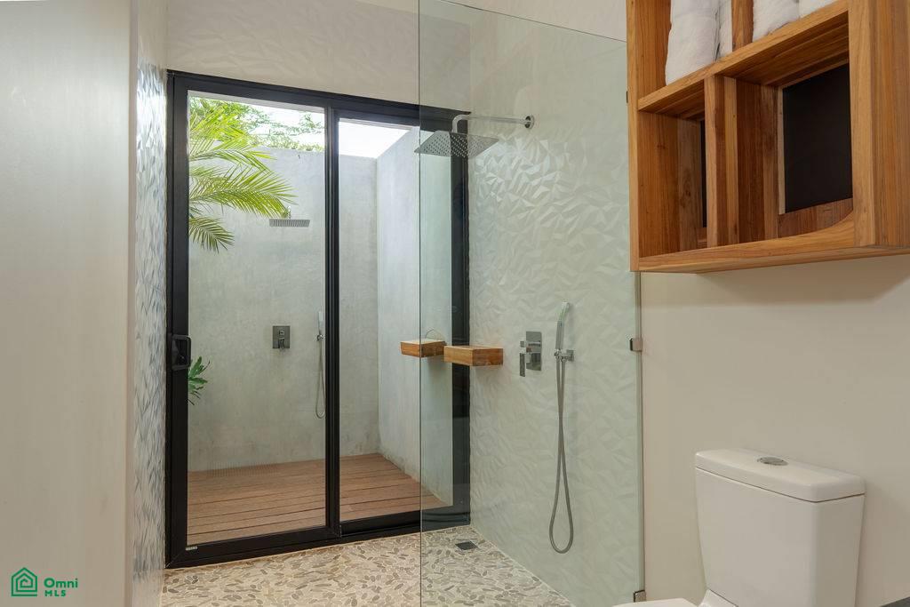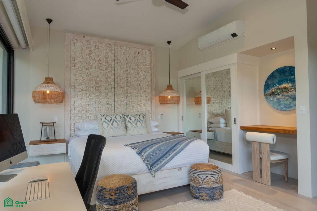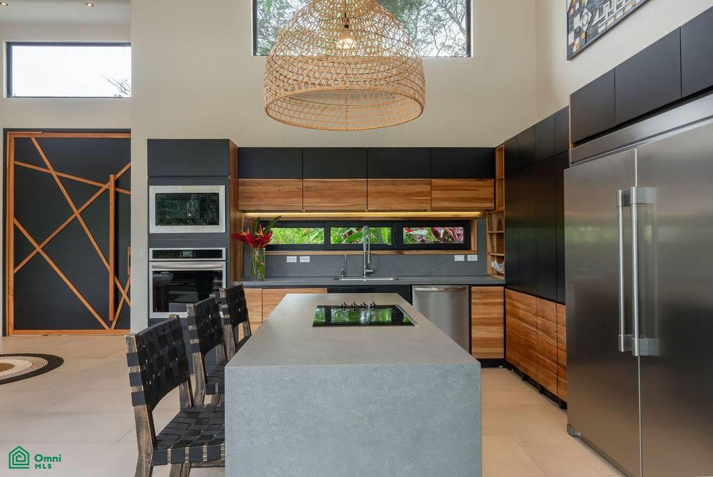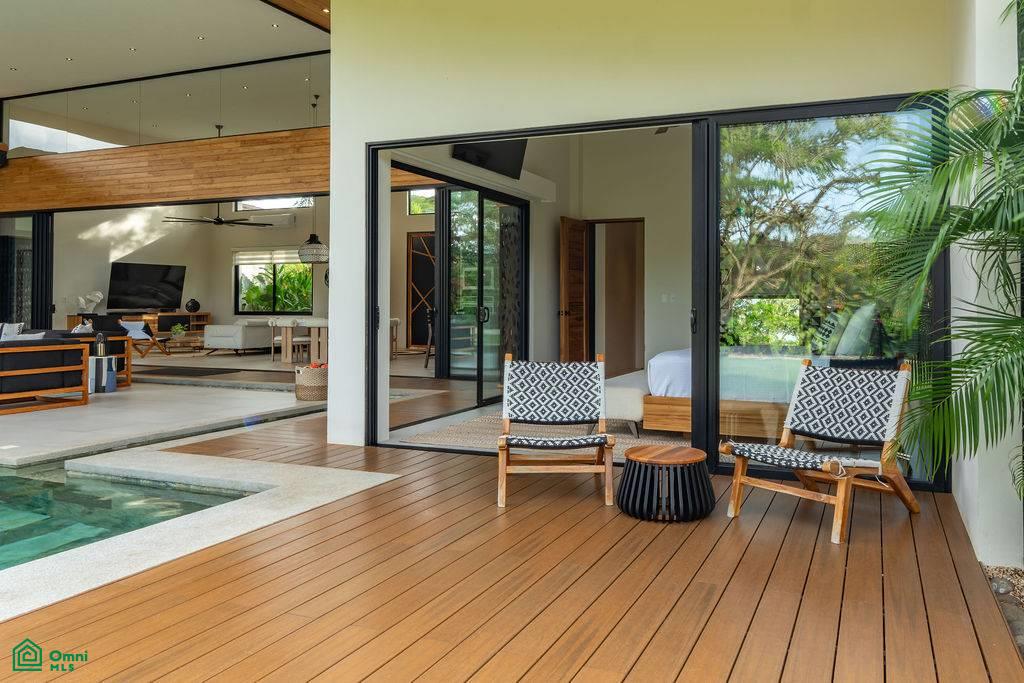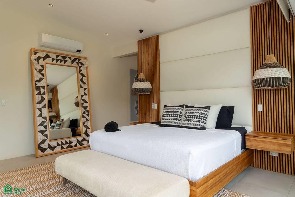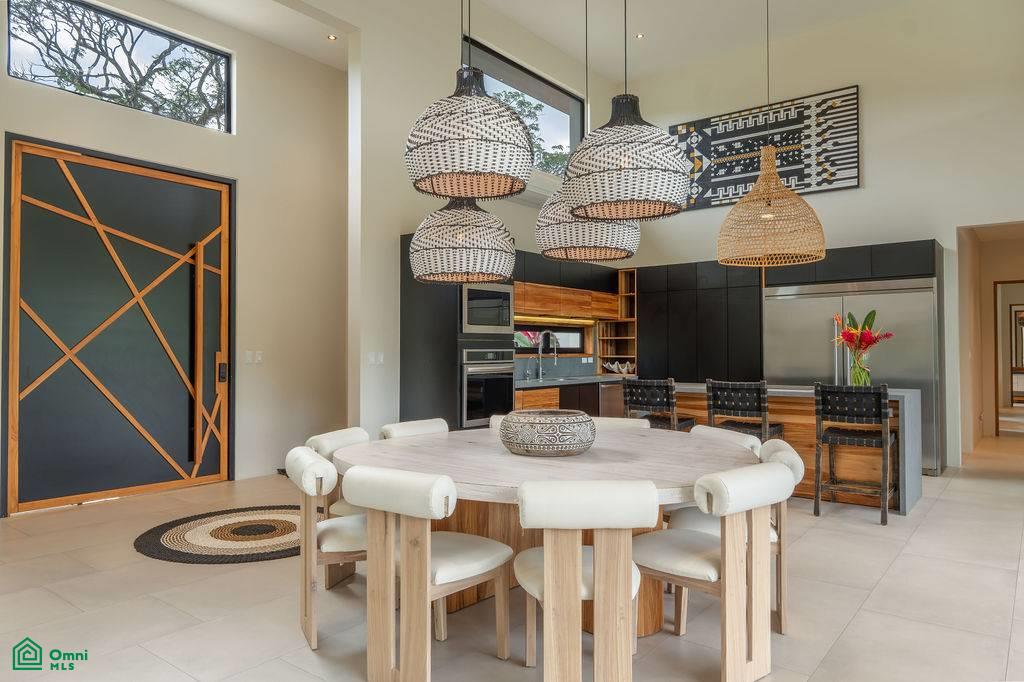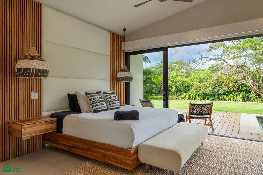 From the moment you arrive, a mature Guanacaste tree and a meticulously landscaped garden set the tone. Inside, a grand pivot door opens to a light-filled living space with full-height sliding glass doors that dissolve the boundary between indoors and out.