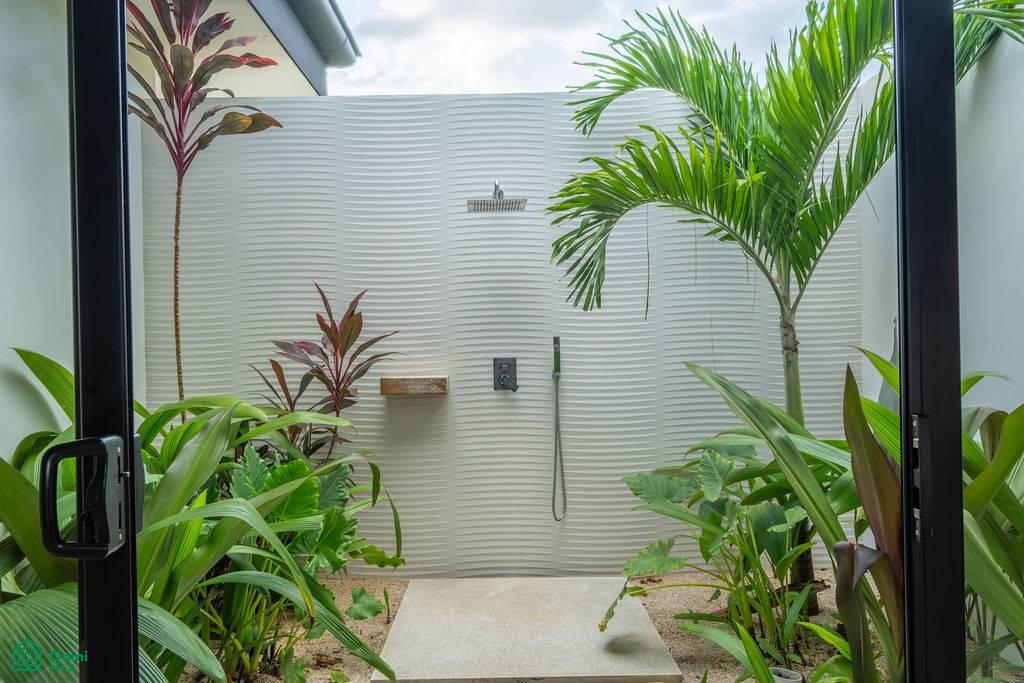 Two additional bedrooms each have their own ensuite bathrooms with indoor and outdoor showers, while a fourth bedroom shares a beautifully appointed bathroom with the main living area. In total, the home sleeps up to 12 guests in comfort and style.