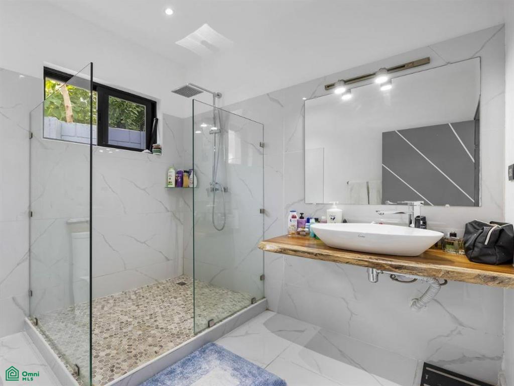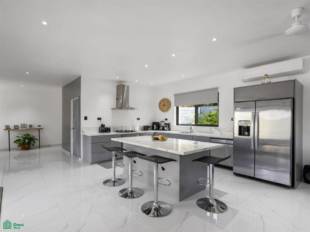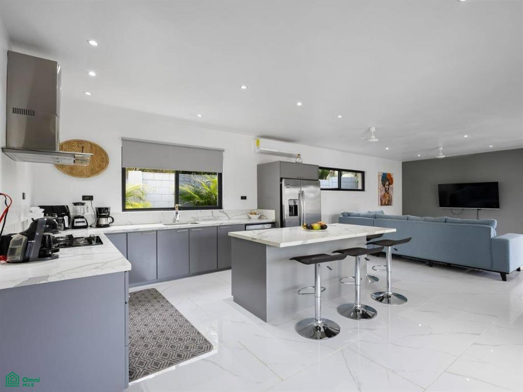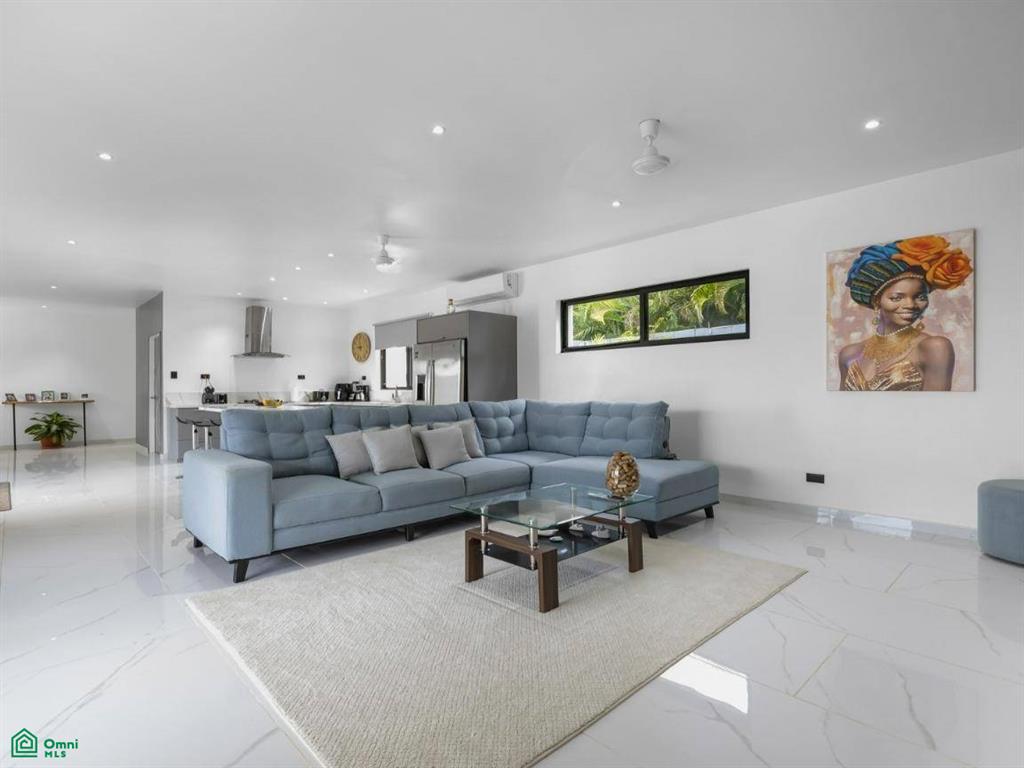 At the heart of the home is a bright and open living space that includes a contemporary kitchen with an island and bar seating, a cozy lounge area, and a seamless connection to the covered outdoor terrace and pool area —perfect for entertaining or relaxing with family.