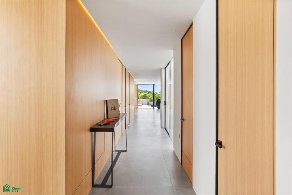 -The central corridor links private and public spaces with garden views.