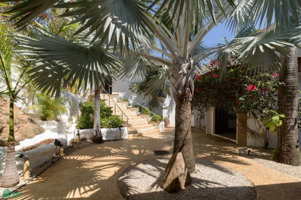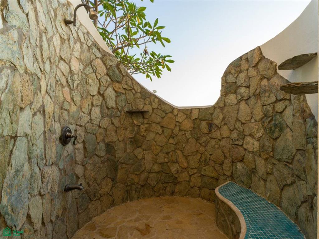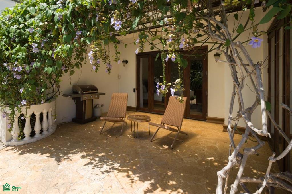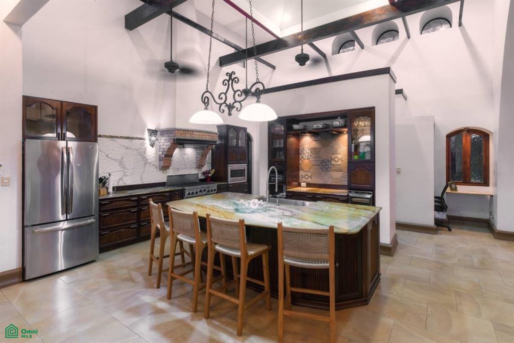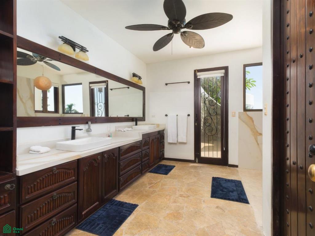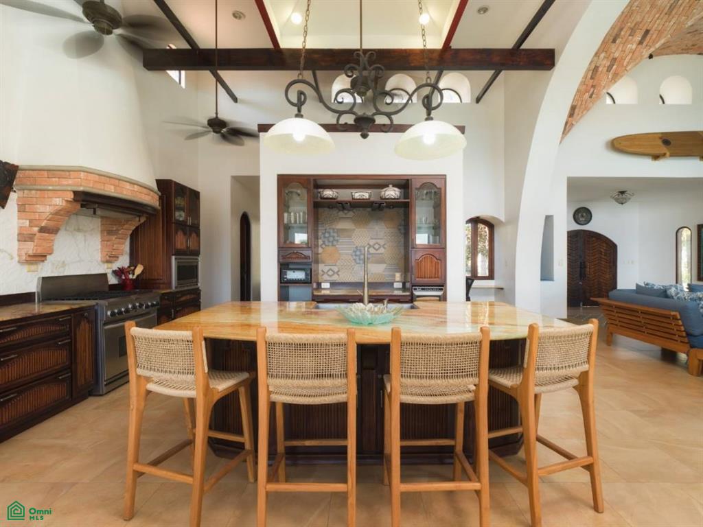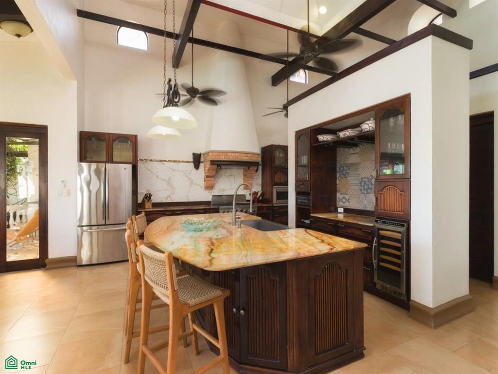 Inside, discover the essence of Spanish living with four spacious bedrooms, each featuring en-suite baths, king-sized beds, air conditioning, and ceiling fans. Some bedrooms showcase intricate cane ceilings, adding to the villa's allure. The bathrooms are adorned with luxurious details such as rock showers and stone wainscoting.