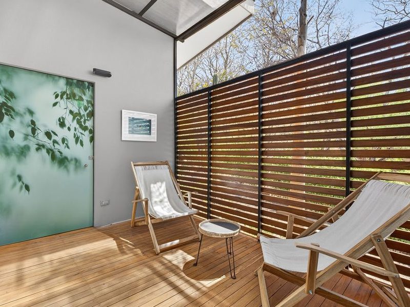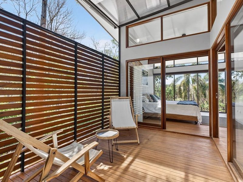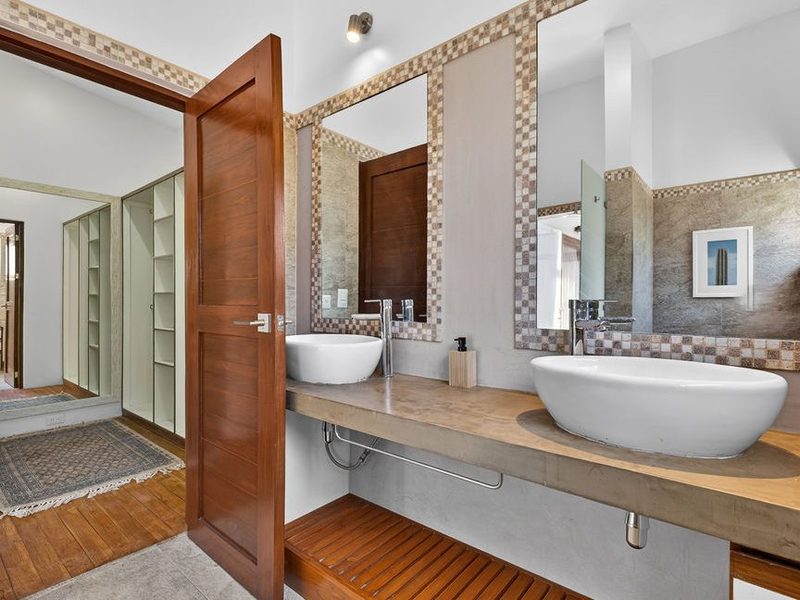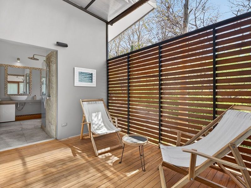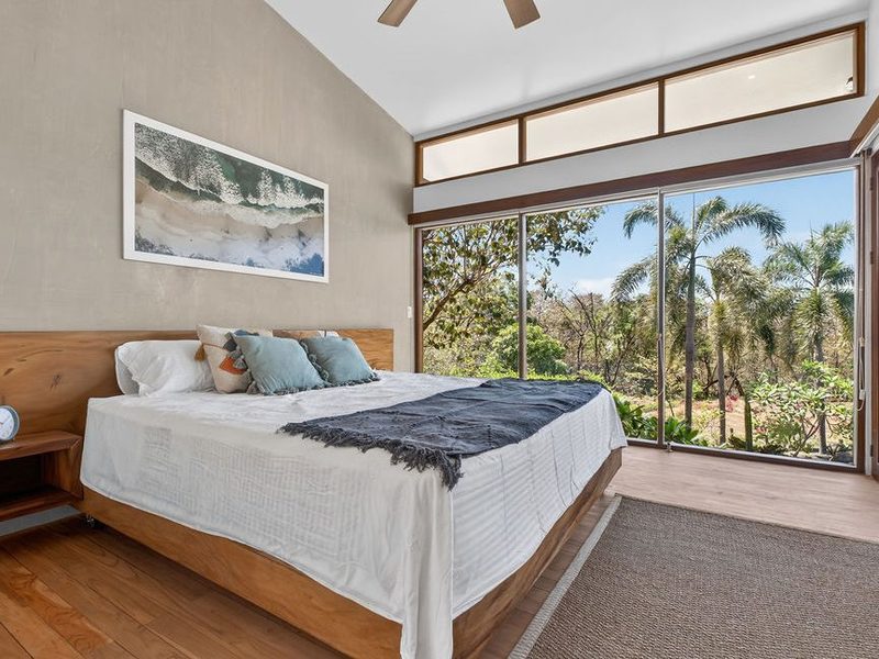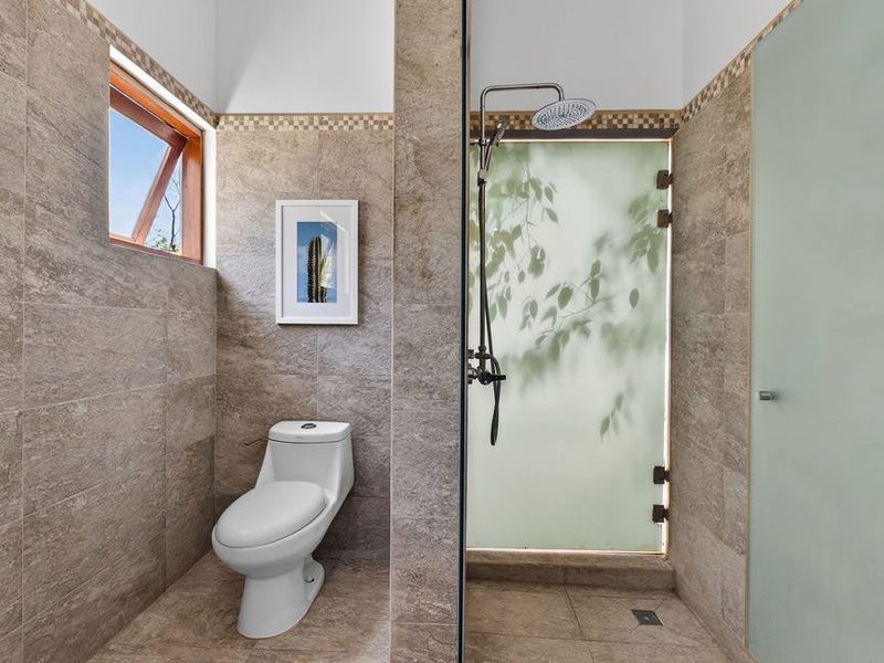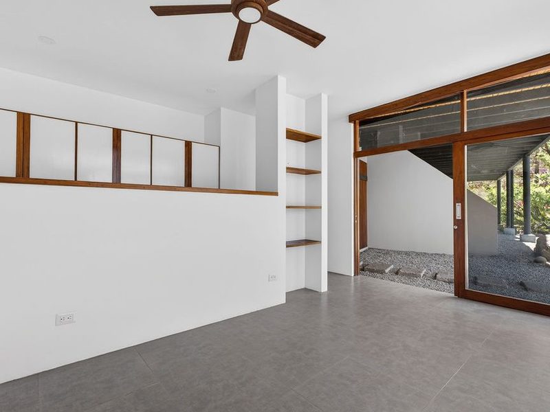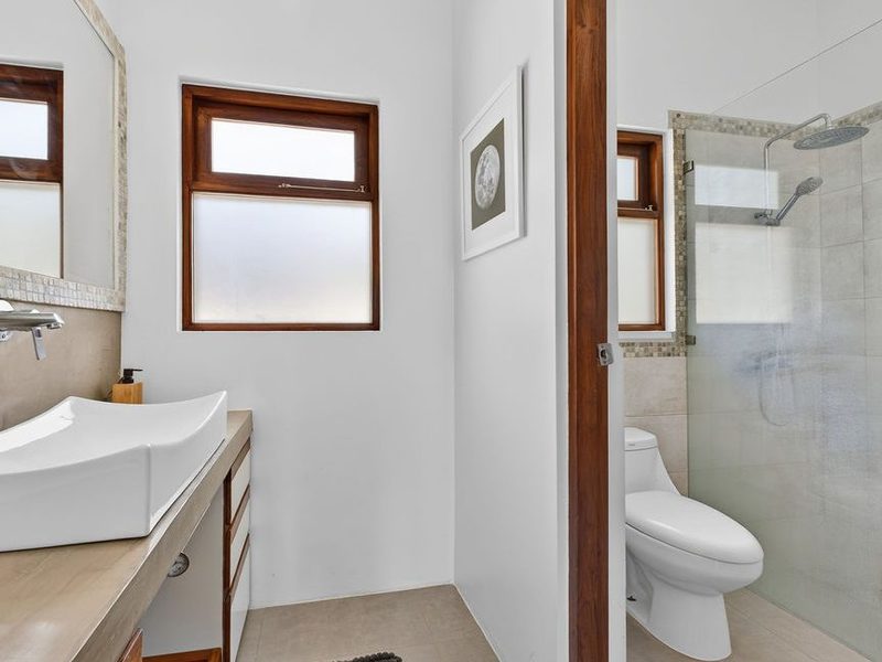 The main level includes three air-conditioned bedrooms, highlighted by a tranquil primary suite with a walk-in closet and an ensuite bathroom featuring a private zen-style outdoor shower. The lower level offers a fully independent guest apartment, ideal for visitors, a home office, or generating rental income.