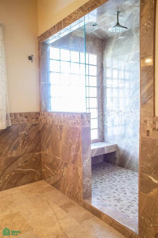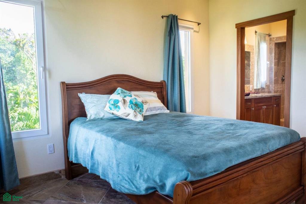 Inside the main home, European windows frame the scenery while filling the space with natural light. Tile flooring extends throughout the main level, where a well-appointed kitchen stands out with high-end appliances, granite countertops, Cedro wood cabinetry, a walk-in pantry, and generous storage. A guest bathroom and a spacious primary suite with walk-in closet and ensuite bath allow for comfortable single-level living.