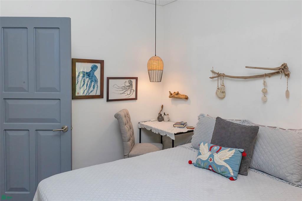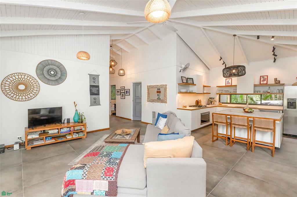 The main house is light and bright with a high ceiling and a wall of sliding glass doors; it speaks to those who appreciate casual comfort. Two of the bedrooms have attached full baths, and each has air conditioning, ceiling fans, and large windows. The kitchen is designed for those who love to cook and entertain and includes a large center island, plenty of storage space, and high-quality appliances. A rustic wooden dining table with seating for at least fourteen is a highlight of the outdoor living area and encourages gath