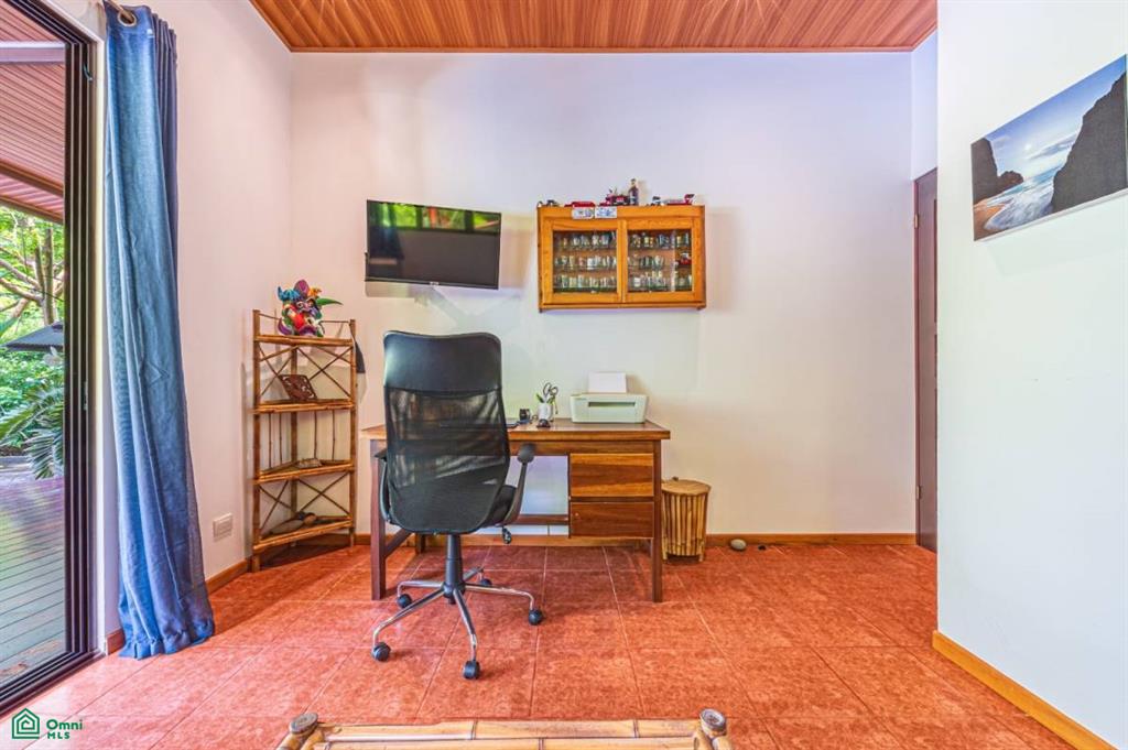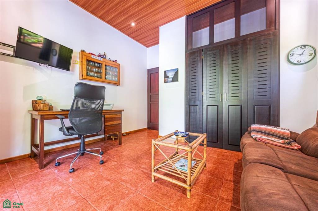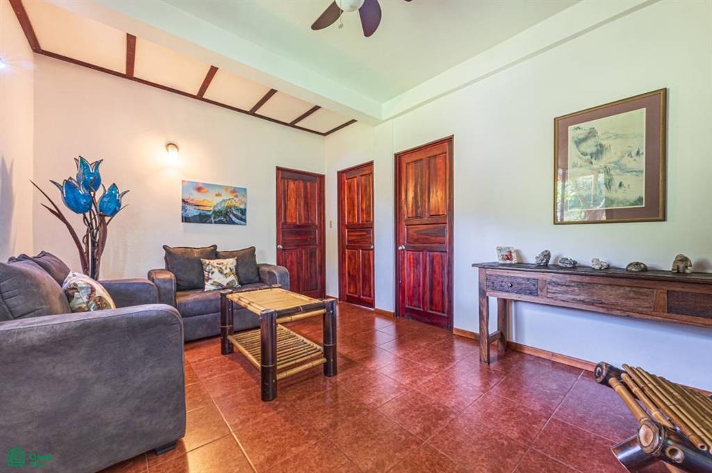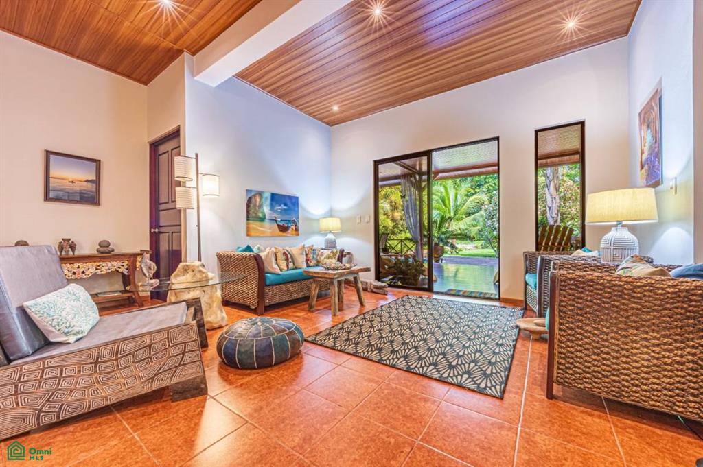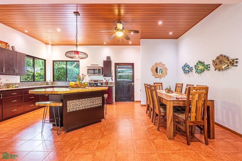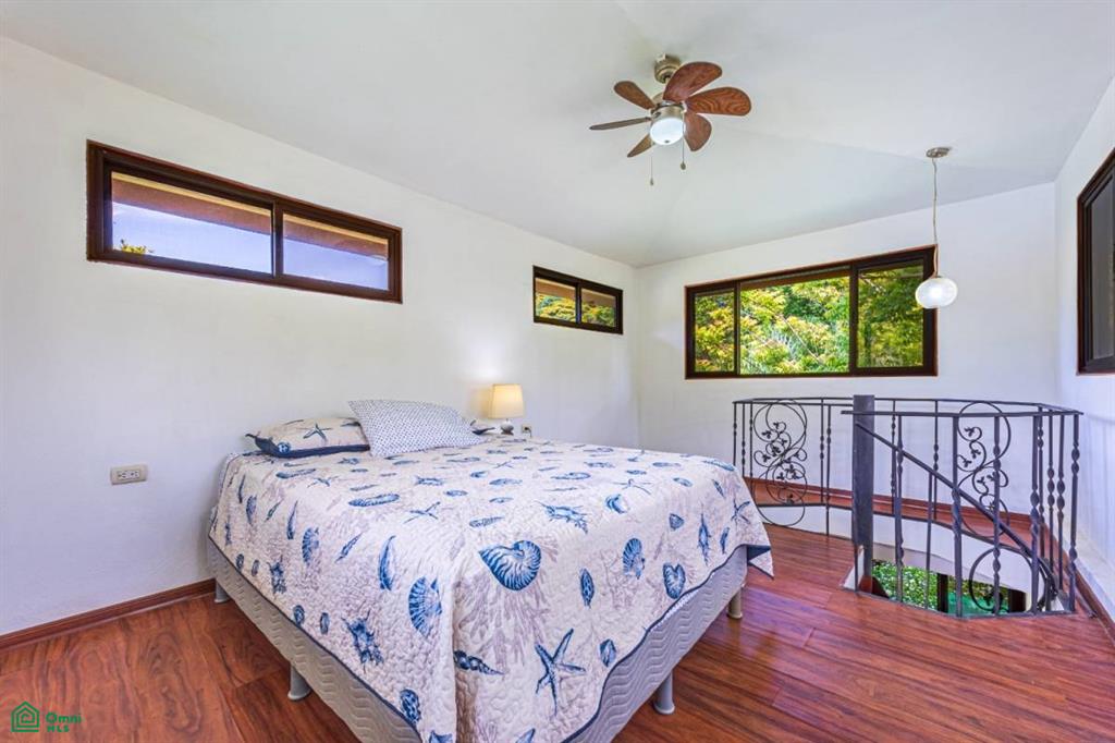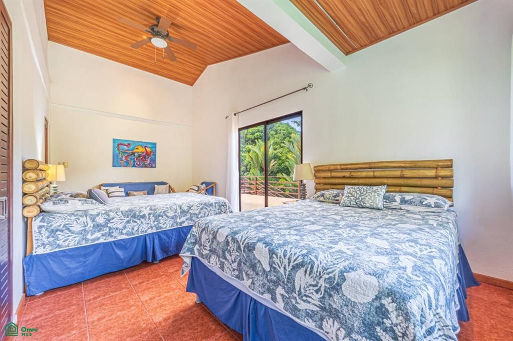The home has a great indoor/outdoor kitchen and rancho, with a huge covered sitting lounging area at the front of the house next to the pool. Three of the five bedrooms have deep porches directly connected to the rooms. The kitchen has all new granite counters and a custom-made island with a one-piece Guanacaste top and two matching stools. On the second level, there are two large bedrooms, a sitting area that would make a great office, and a huge outdoor porch for sunning, yoga, evening star gazing, and more.