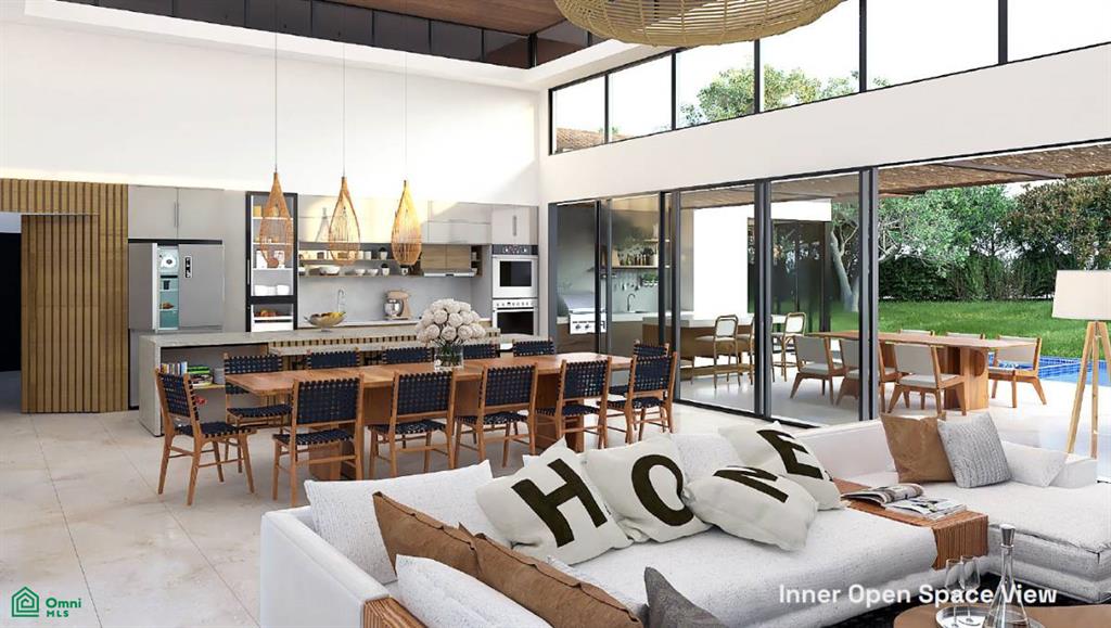 The heart of the home is its expansive open-plan living area, graced by soaring double-height ceilings and bathed in natural light. Walls of glass blur the boundaries between inside and out, leading to a vast terrace with a fully equipped outdoor kitchen, al fresco dining area, and inviting spaces to relax or entertain.