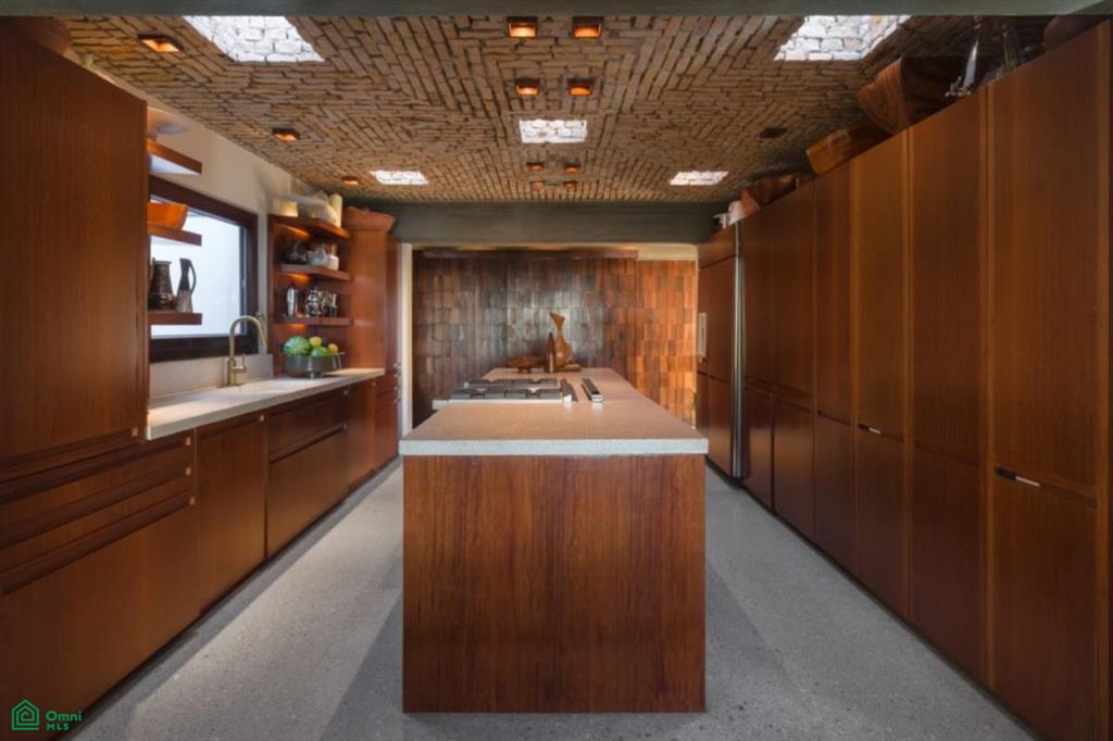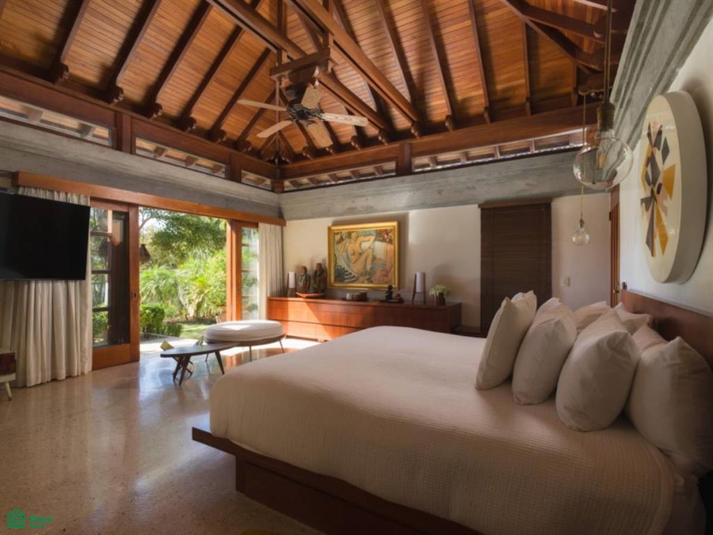 The home design is a true work of art, with expansive windows that flood the interiors with natural light and create a seamless connection between the indoor living spaces and the surrounding mature + tropically landscaped grounds. The use of “Almendro” wood throughout the home adds both warmth and sophistication to the experience.