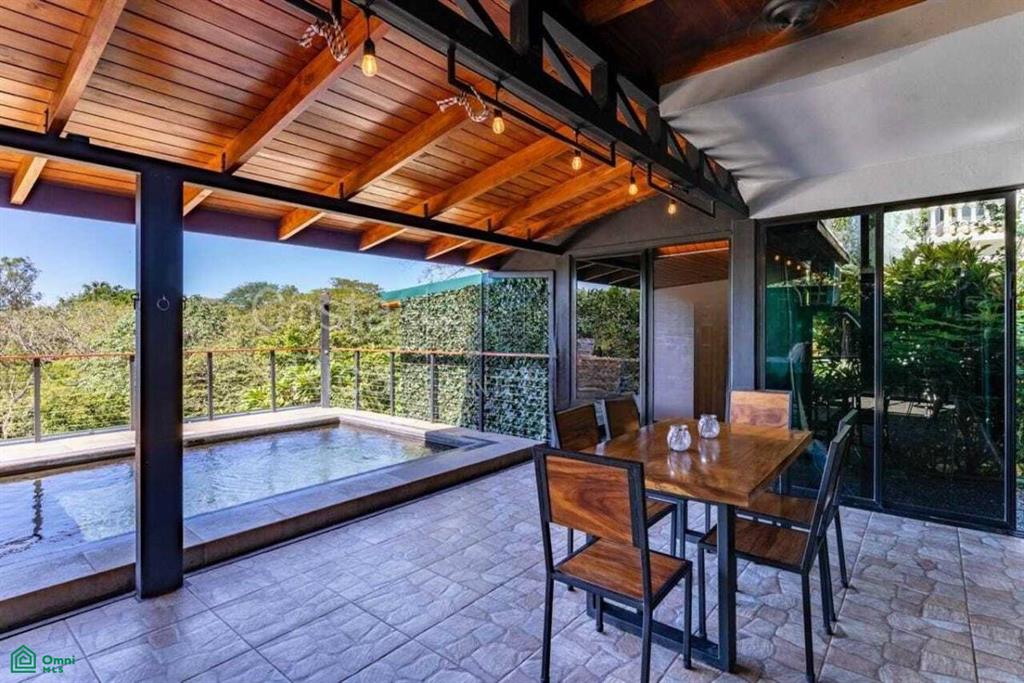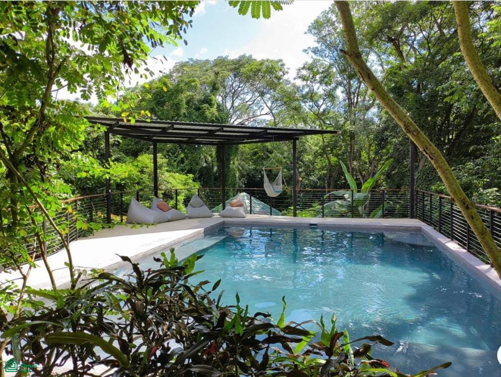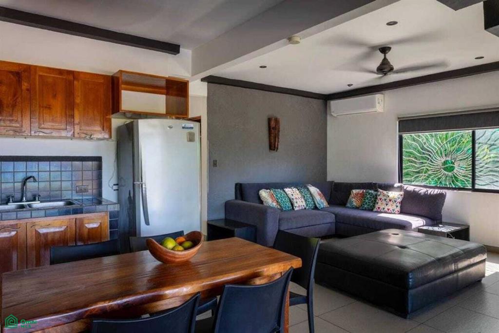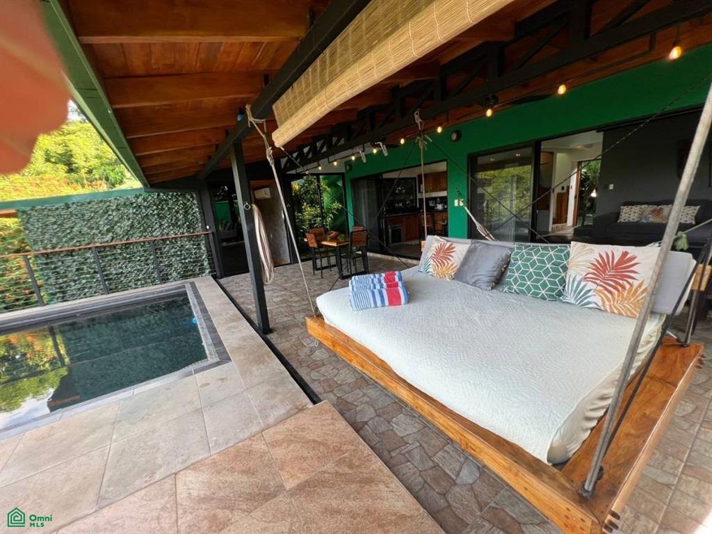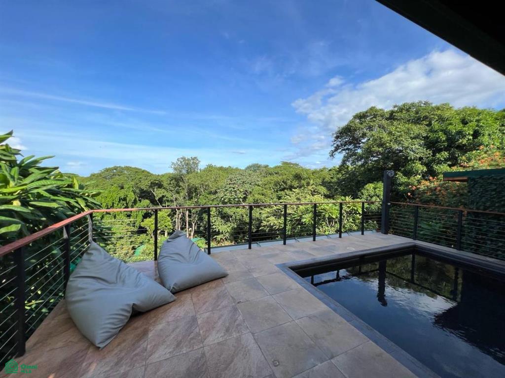 - Kitchen, living area, and large balcony with pool and jungle views