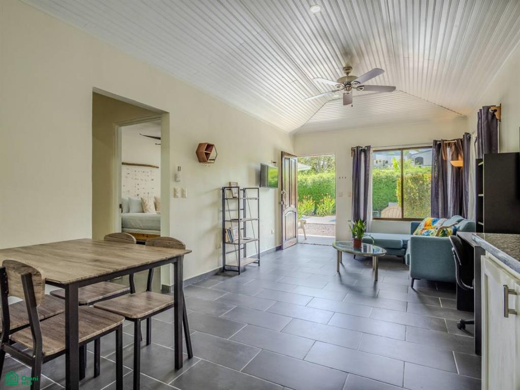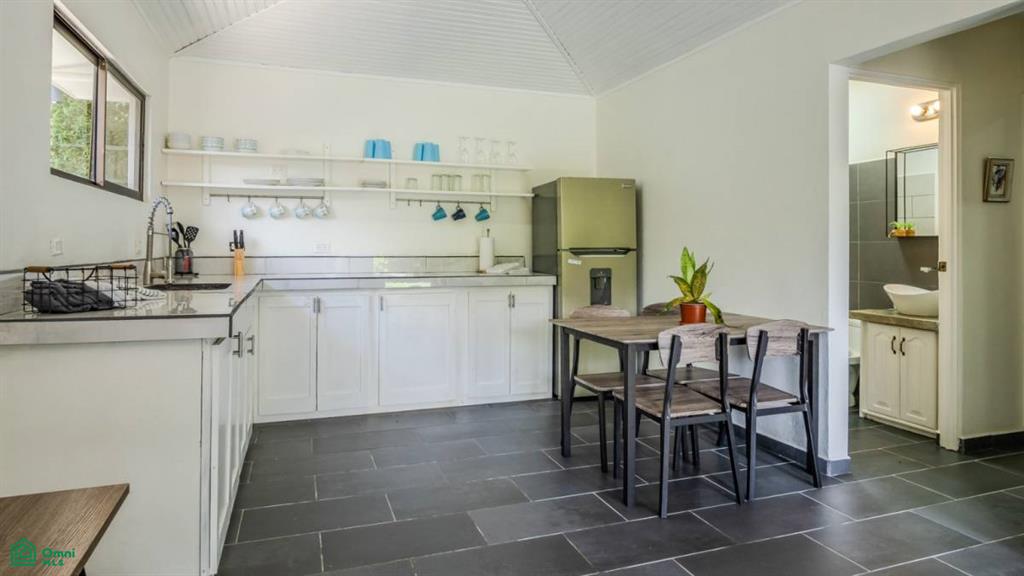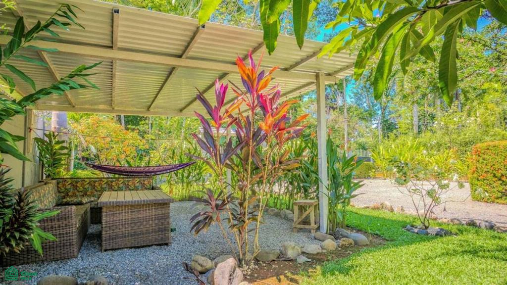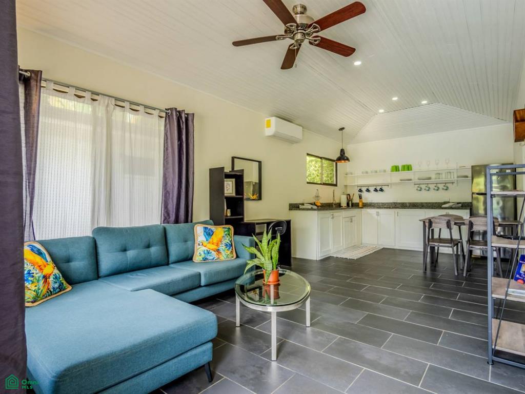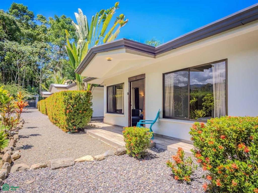 The resort features three solidly built 2-bedroom cabins – bright, spacious and air-conditioned, these cabins will delight guests with the comforts and necessities of a home away from home. Beautiful, tall flowering hedges surround the structures to ensure total privacy. Nearby outdoor spaces – under the cover of a front-porch roof or under the welcoming sun – invite to enjoy a hot coffee or cold drink in the buzzing, exotic and tropical ambience. The kitchens hold a full-sized fridge, plentiful counters & storage, and a dining table while the attached living areas are equipped with a TV, couch, a desk/work space and a coffee table. Two bedrooms feature windows that look out onto the greenery and flood the rooms with natural light. Fully equipped bathrooms, one per cabin, complete the offer – a perfect getaway to where the mountains meet the Pacific surf!
