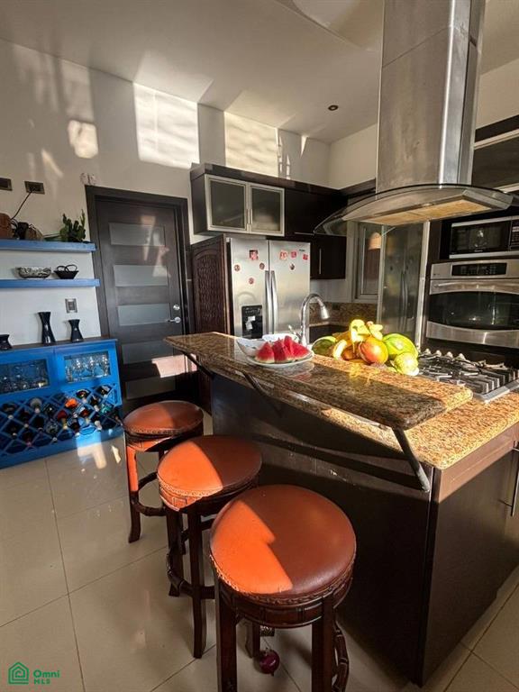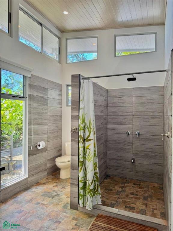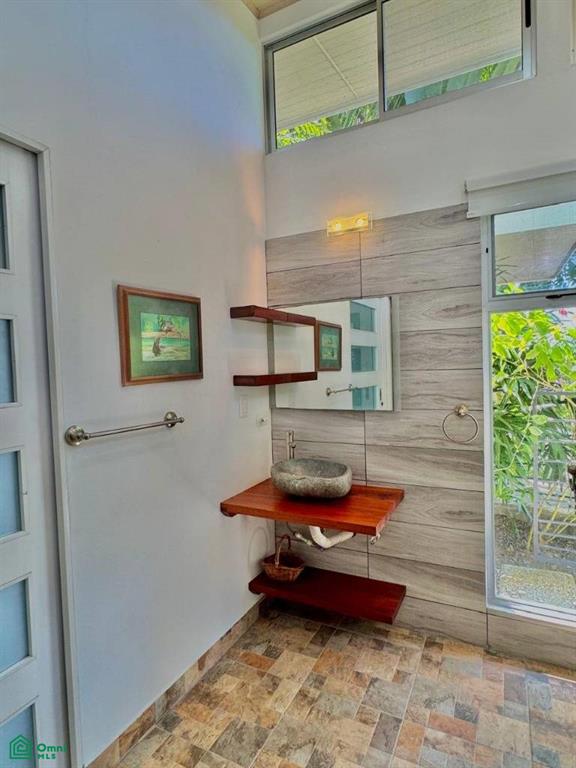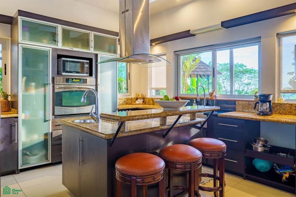 Outdoor bathroom, kitchen, and newly renovated BBQ/wet bar area.