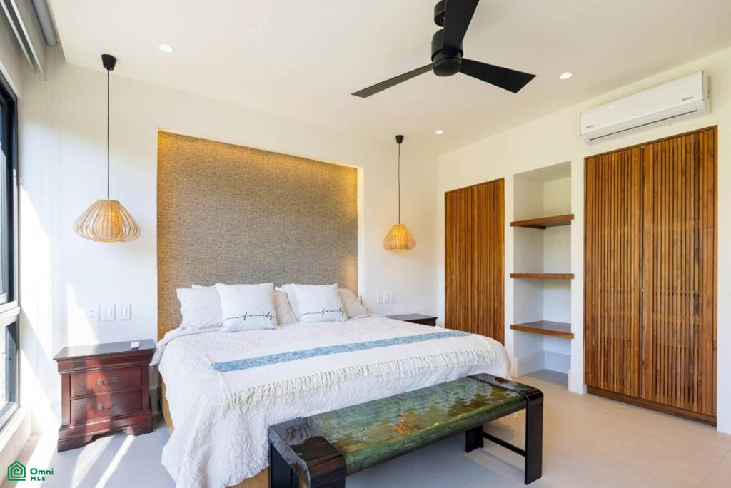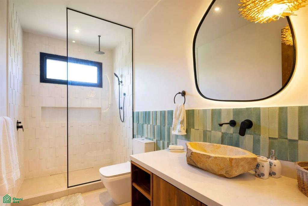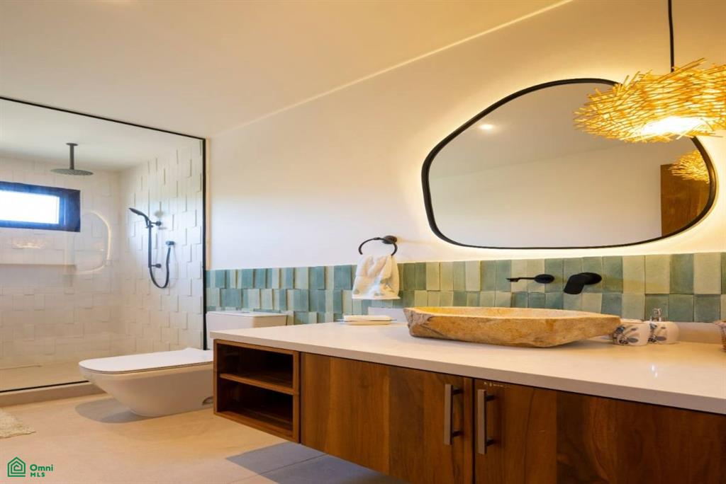The outdoor areas are among the homes greatest highlights. A beautiful Sukabumi tile pool anchors the backyard and is complemented by a new beach padel court and a soft sand volleyball space. Tall palms and tropical landscaping provide privacy and a lovely sense of escape. From the backyard, a private path guides you on a short 3-minute walk directly to the calm shores of Playa Bonita.
