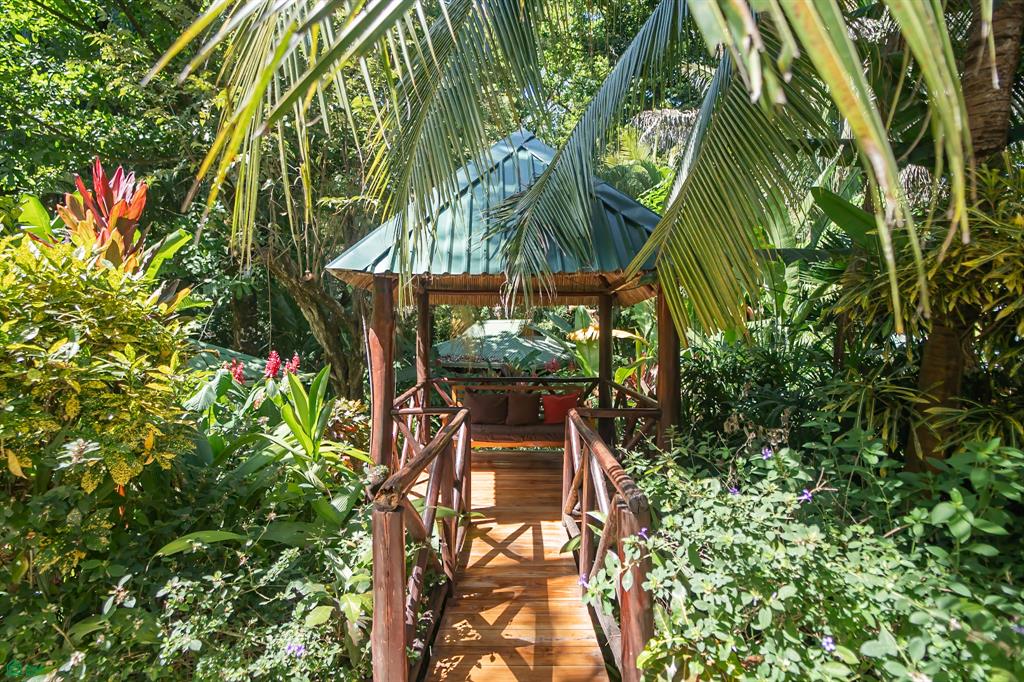 Resort-style amenities include a central swimming pool with covered deck and waterfall, as well as a traditional palm-thatched rancho where daily breakfast is served amid abundant wildlife, including monkeys, iguanas, butterflies, and tropical birds.