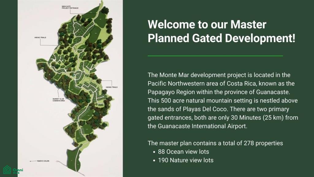 Being released in phases and spread out over 500 acres, Monte Mar is a new low-density development in the Guanacaste province of Costa Rica. Offering larger, much sought-after properties close to the beach, entertainment, and the services of Playas del Coco, affectionately known as, El Coco or the Coconut. While giving room to stretch your arms, so to speak, this family-oriented community has been years in the making and fills a need for more exclusive lots close to the beach. Located 30 minutes from Liberia International Airport (LIR) with its direct flights from many gateway cities.