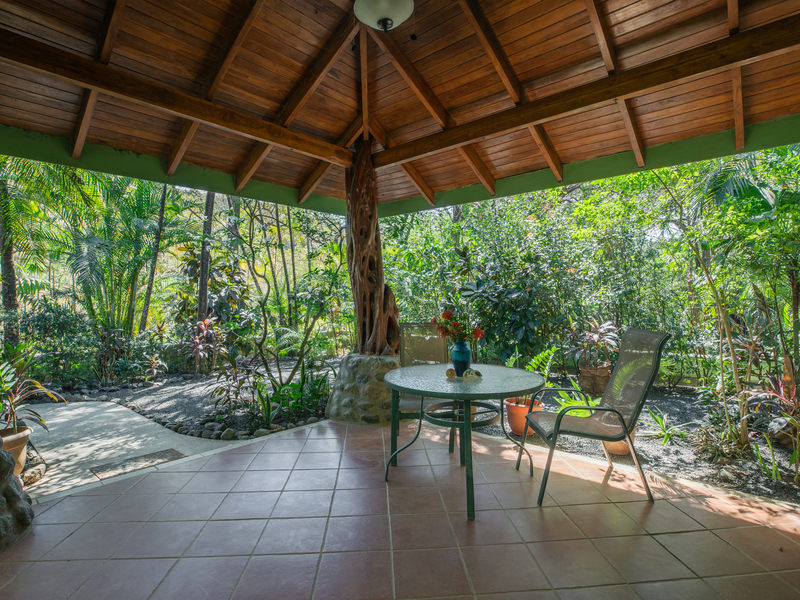 Step outside to a private garden terrace, where tropical landscaping surrounds the space and offers a peaceful outdoor retreat—ideal for slow mornings, casual dining, or relaxing after a day at the beach.