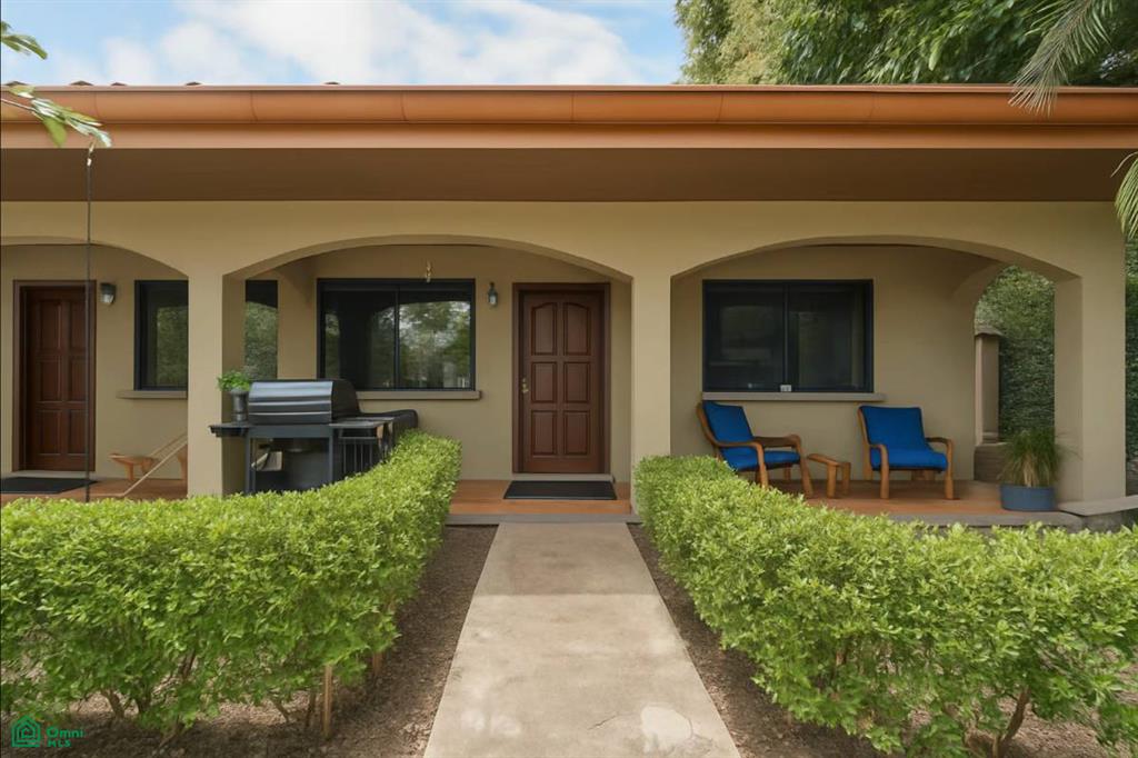 The community is designed for relaxed tropical living, featuring a resort-style pool, rancho with BBQ area, shaded lounging spaces, and private parking.