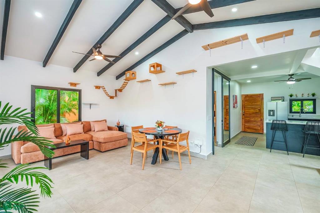The open living area, guest bedroom, and kitchen flow onto the spacious patio, which can be screened if desired. Upstairs features the master suite with a terrace perfect for sunsets. Equipped with fiber optic internet up to 200 Mbps, this turnkey property is ideal for digital nomads, vacationers, or investors seeking a peaceful retreat or rental investment in the competitive Guanacaste market.