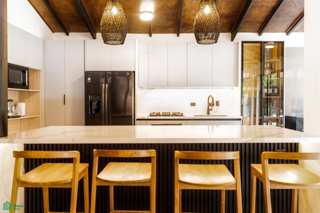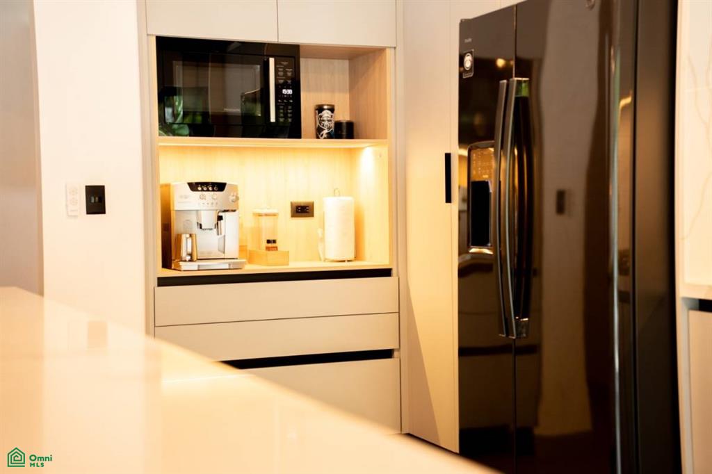 The open-plan gourmet kitchen, complete with waterfall-edge island and built-in coffee station, flows seamlessly into the living and dining areas—ideal for both relaxation and entertaining. Step outside to your private pool and patio surrounded by lush landscaping, or unwind in the dedicated yoga/exercise platform perched amid the treetops.