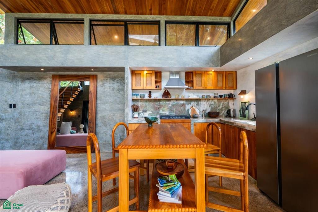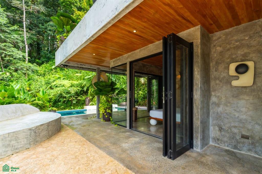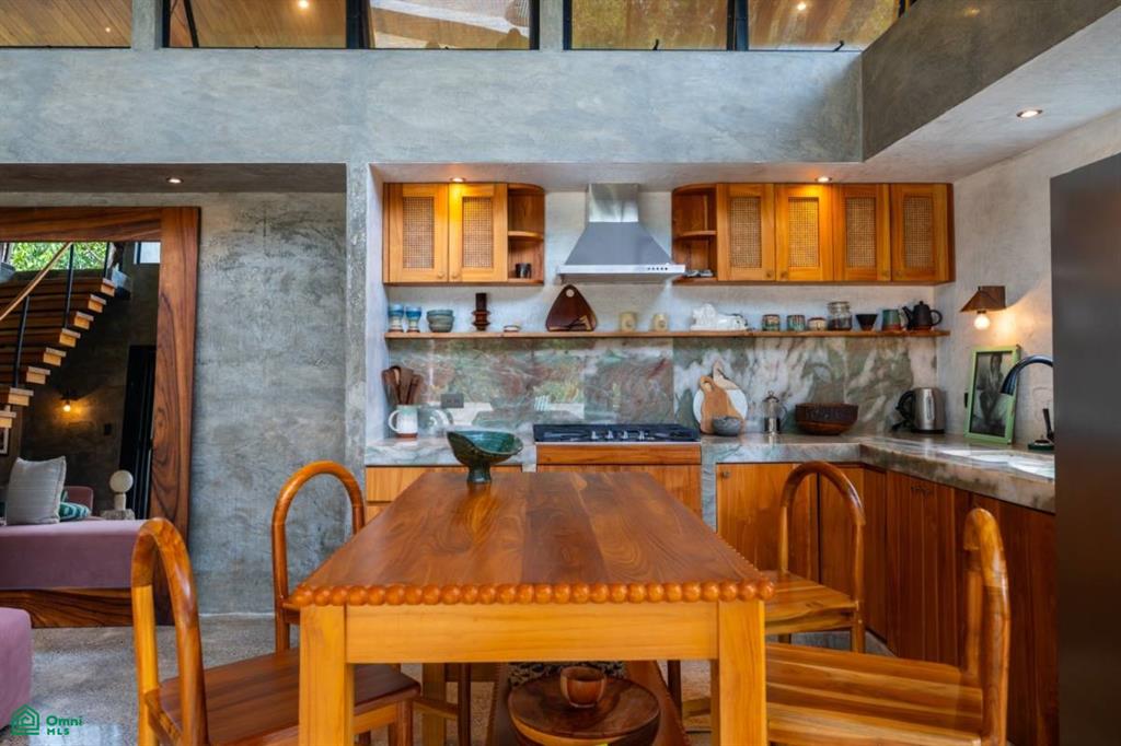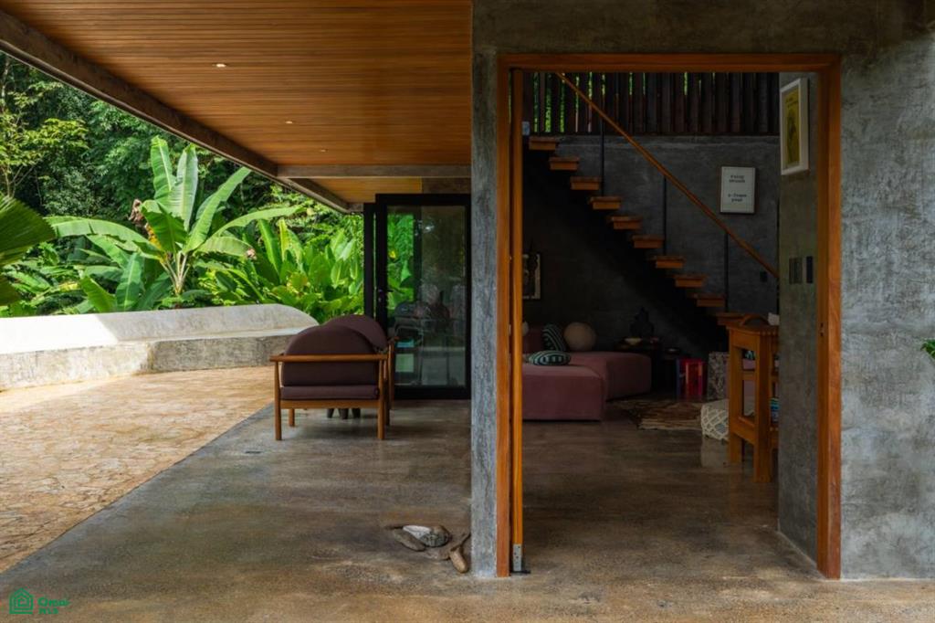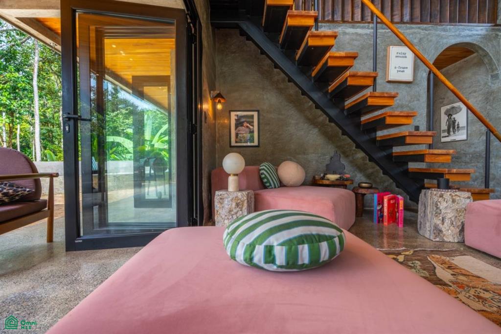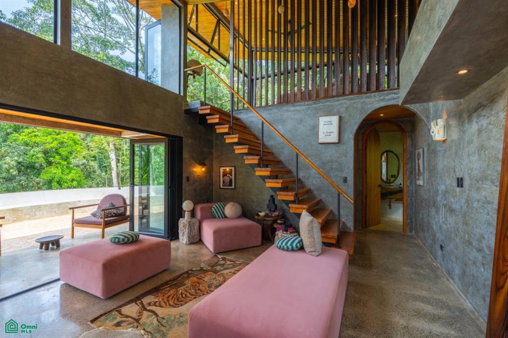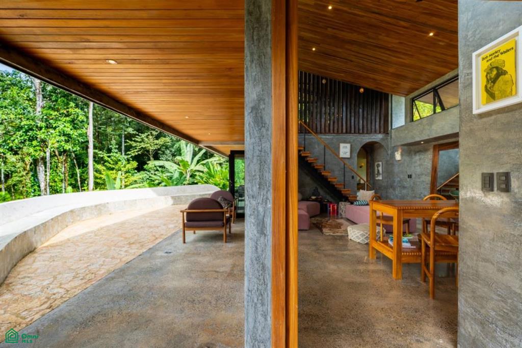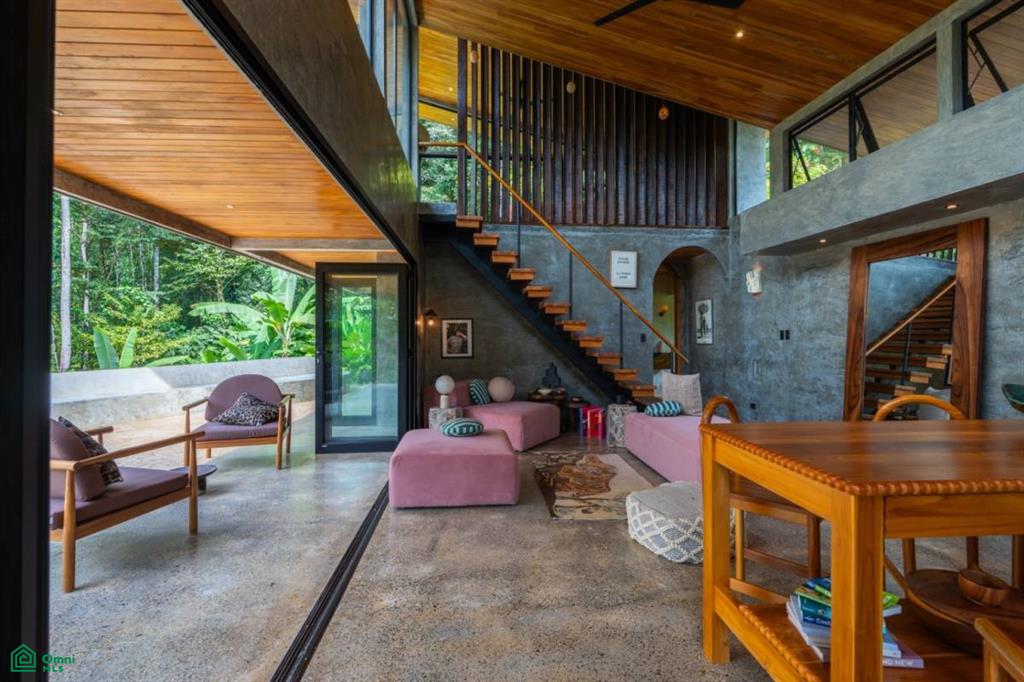 Outdoor terraces and the private pool, surrounded by mature tropical vegetation, create an intimate, resort-style atmosphere ideal for relaxation and entertaining. Vertical circulation is articulated through a floating wooden staircase, maintaining visual continuity while introducing double-height spaces, natural light play, and shifting perspectives toward the jungle.