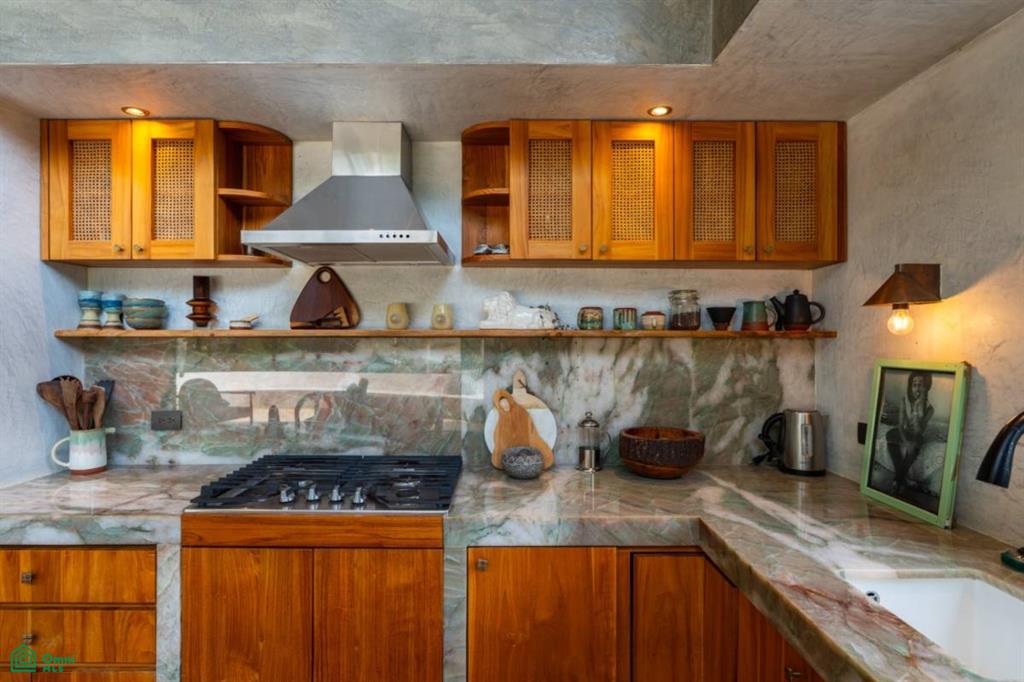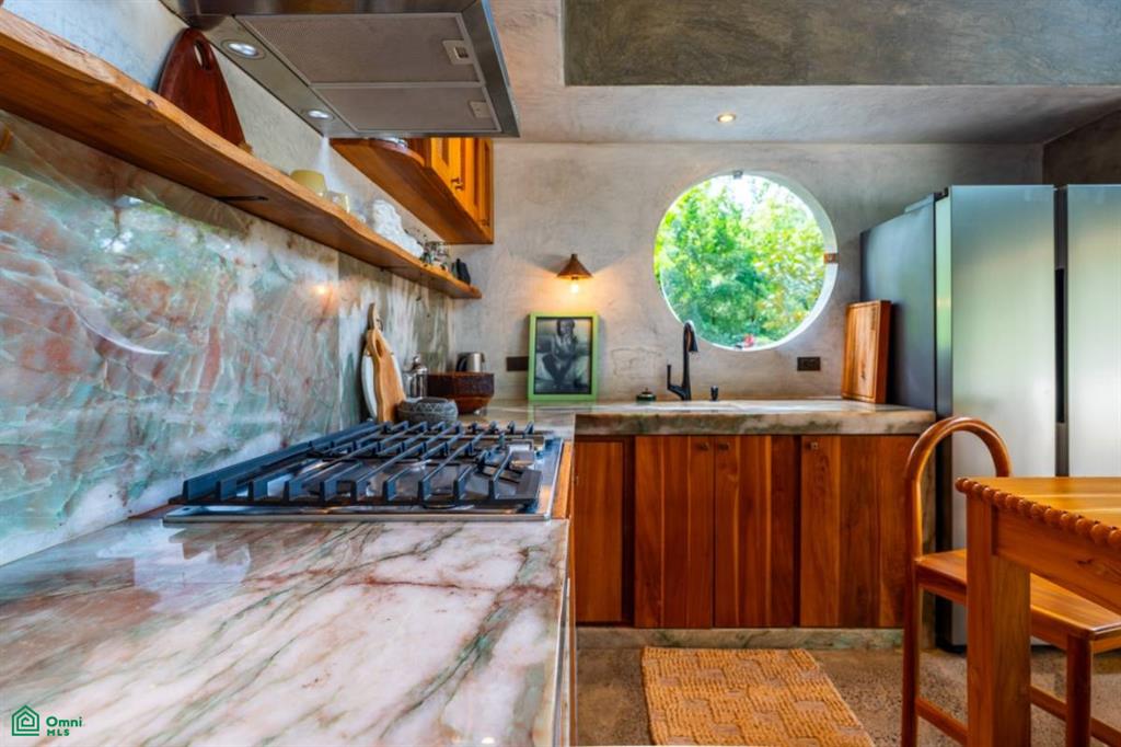 The kitchen stands as a central design element, featuring high-end natural stone countertops with organic veining that reinforce the dialogue between architecture and nature.
