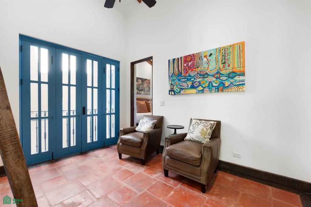Upstairs, a cozy sitting area connects two spacious bedrooms, each with an en-suite bathroom. The primary suite features a private balcony overlooking the lush surroundings and peaceful streets of Calle Cartagena.