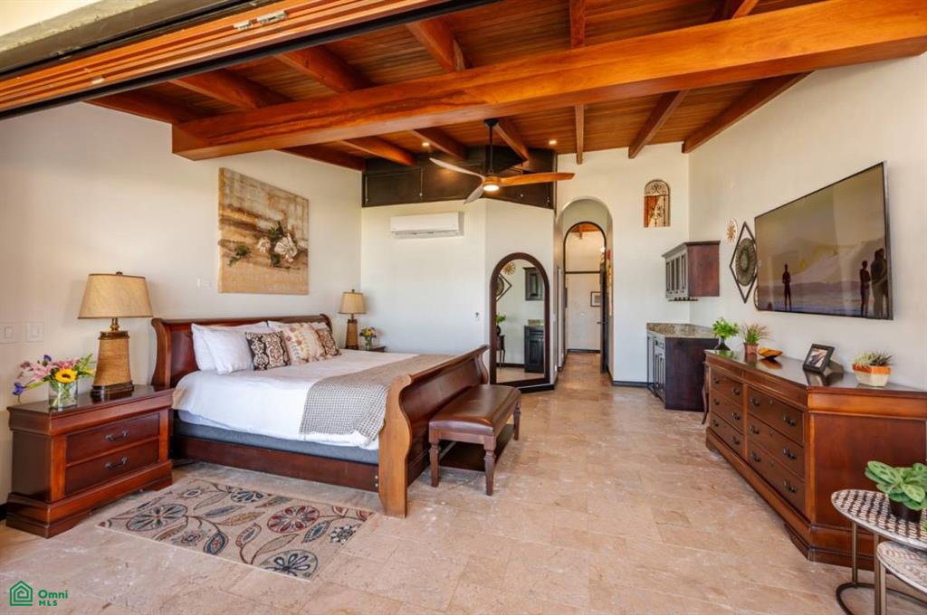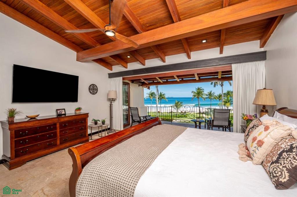 Master Bedroom with Balcony: Wake up to the soothing sound of waves from your second-story master bedroom, featuring a private balcony, bar, large flat-screen TV, and a luxurious king-size bed.