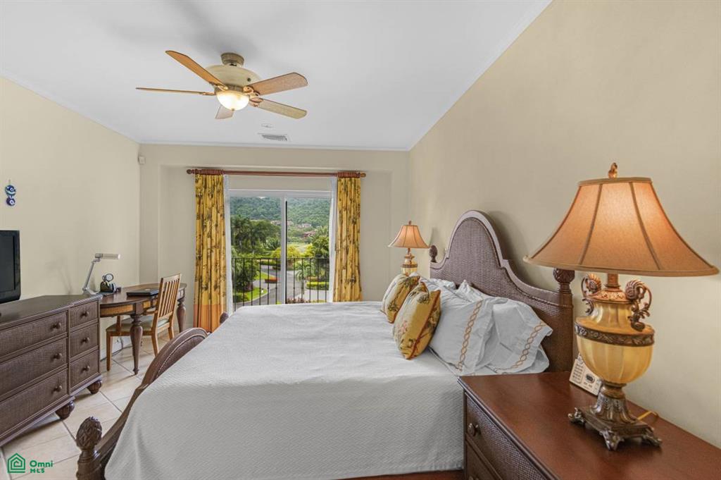 The large covered balcony is perfect for enjoying the tropical climate while overlooking the impeccably landscaped gardens and the vibrant local wildlife. The bedrooms are generously sized, with the primary suite featuring an en-suite bathroom and large windows framing the view.