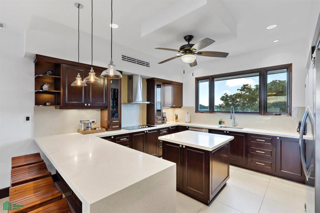 Each portion of the condominium is designed with a stand-alone kitchen, laundry room, and living area. The two-bedroom portion has a large gourmet kitchen with a side-by-side fridge/freezer, stainless steel appliances, a center island, and a breakfast bar. It also features an extra-large living area with bi-fold Pella doors that fold completely open to showcase breathtaking views of Playa Flamingo.