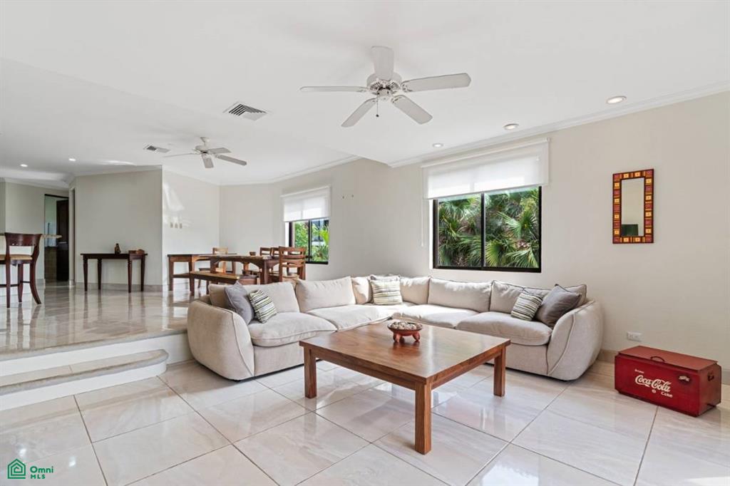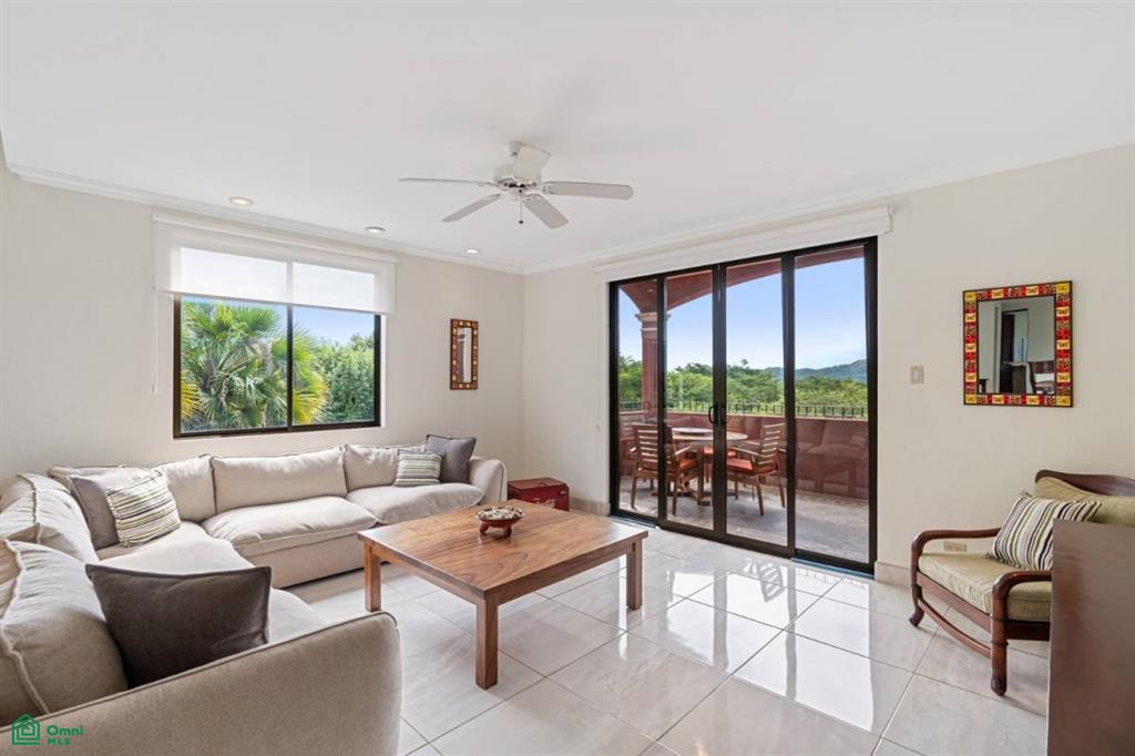 Amplias Zonas de Estar: La sala de estar hundida se abre a una terraza amueblada, ideal para relajarse mientras se disfruta de las vistas al exuberante campo de golf.