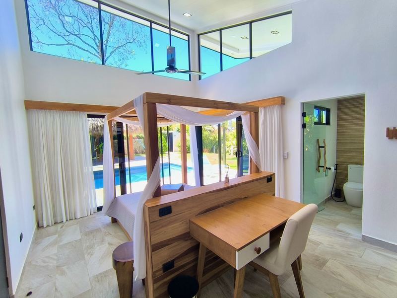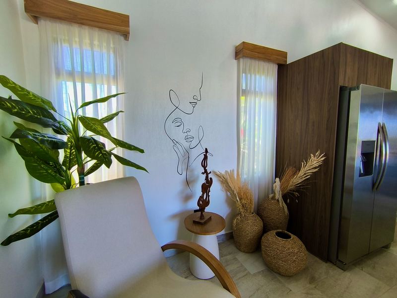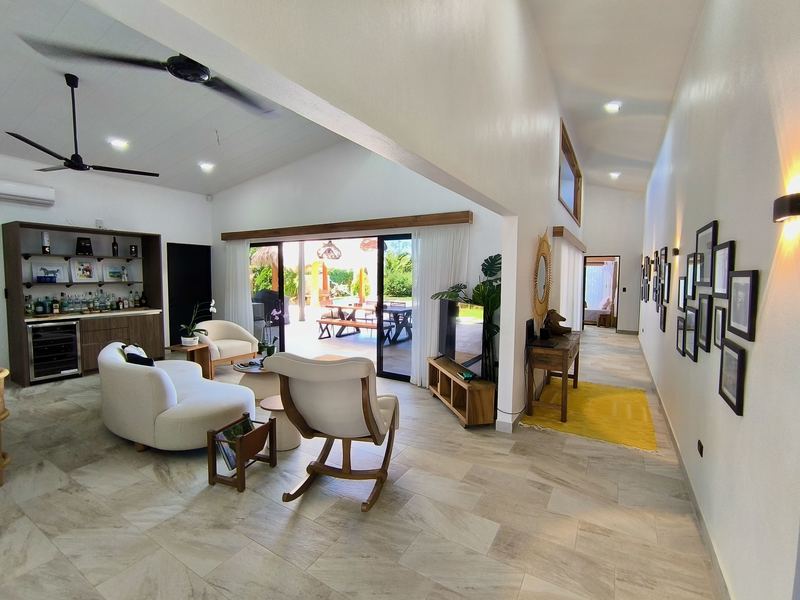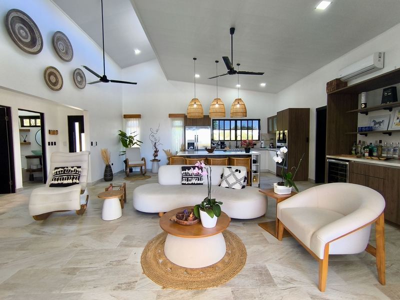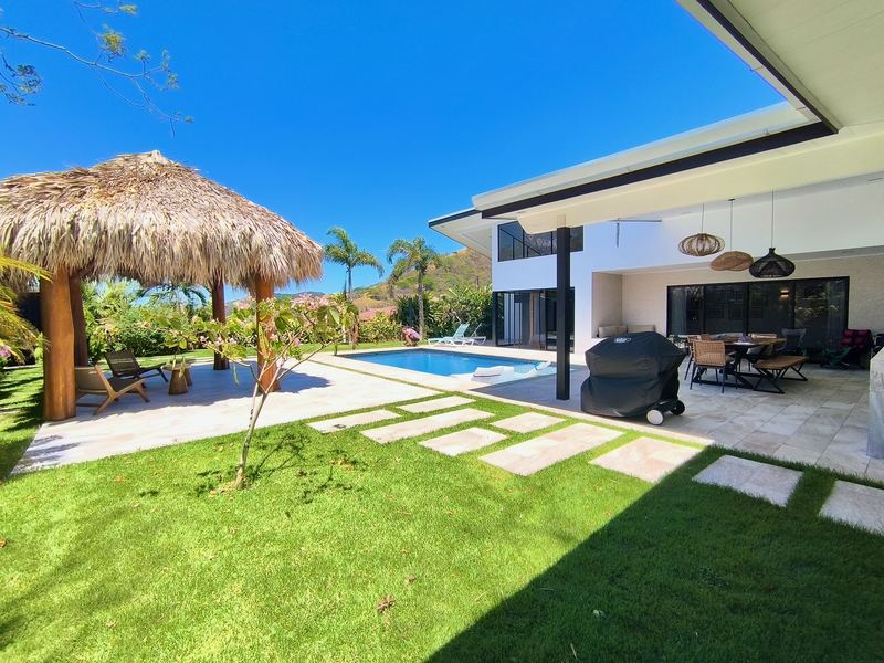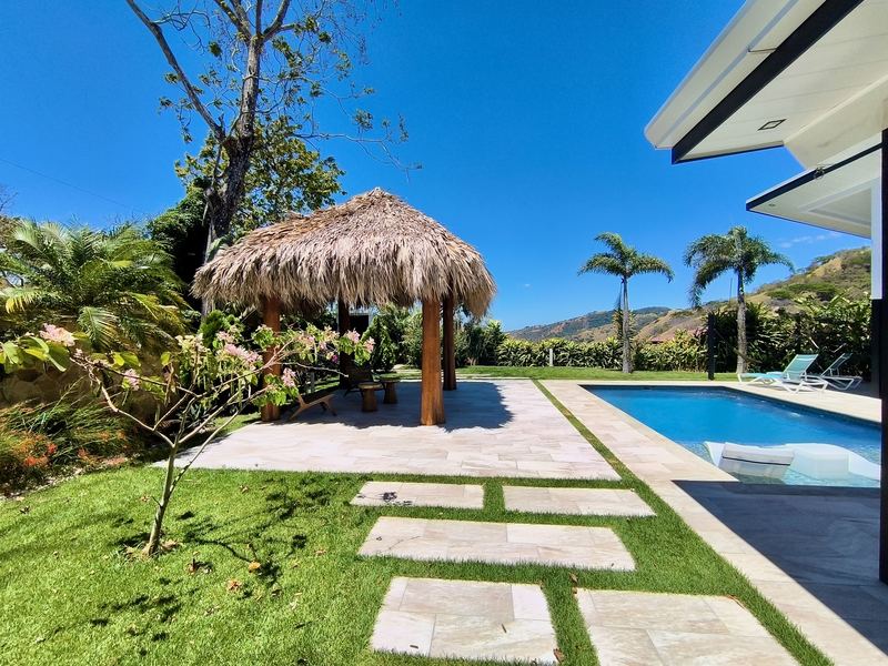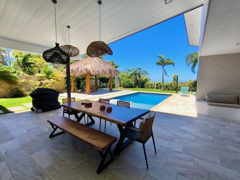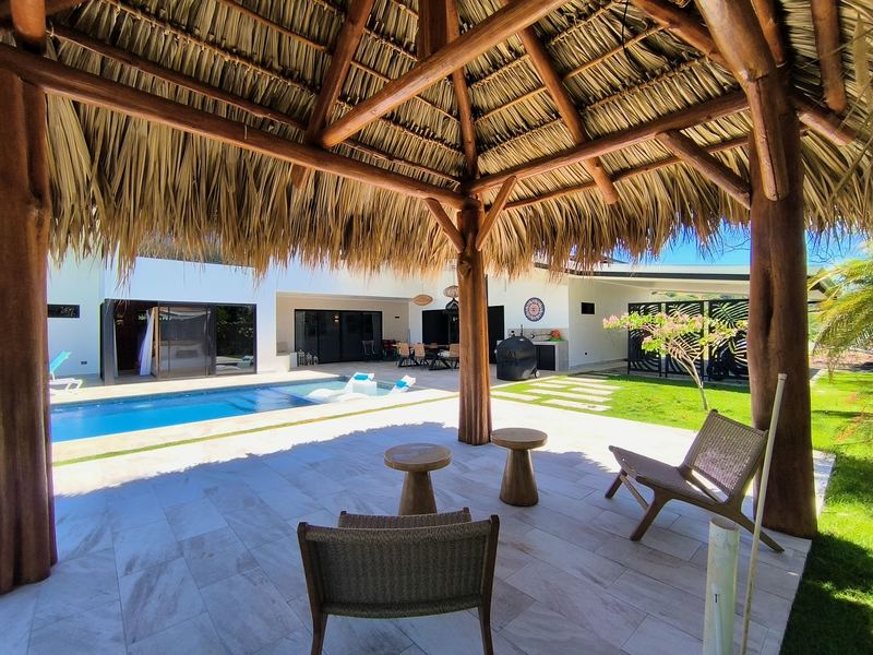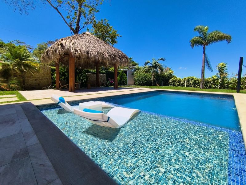 The outdoor living spaces are a true highlight of the property, featuring a covered terrace used as the main dining area, ideal for enjoying the tropical climate. Next to the solar-heated pool, a stunning rancho with an elegant wooden structure, solid wood columns, and a synthetic palm roof creates a refined and inviting space for entertaining.