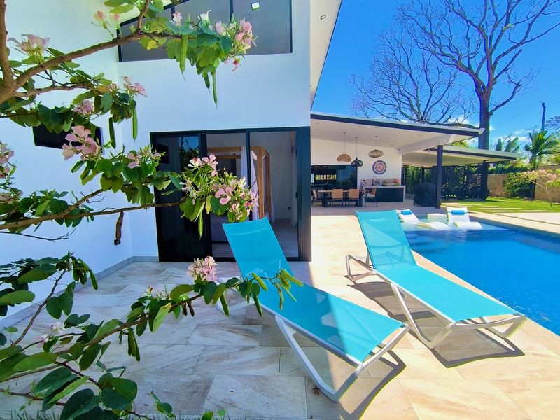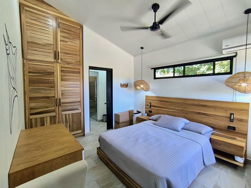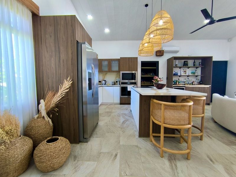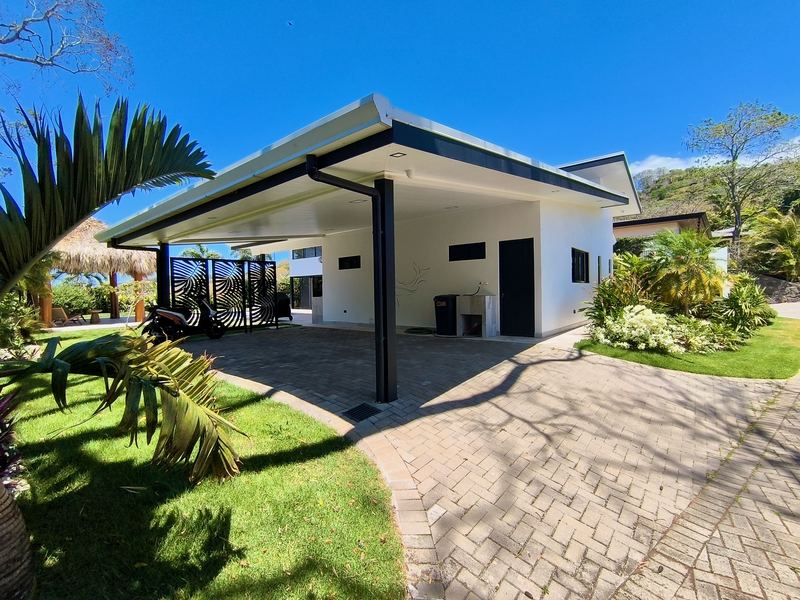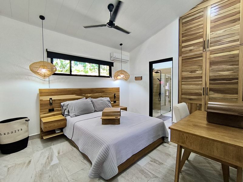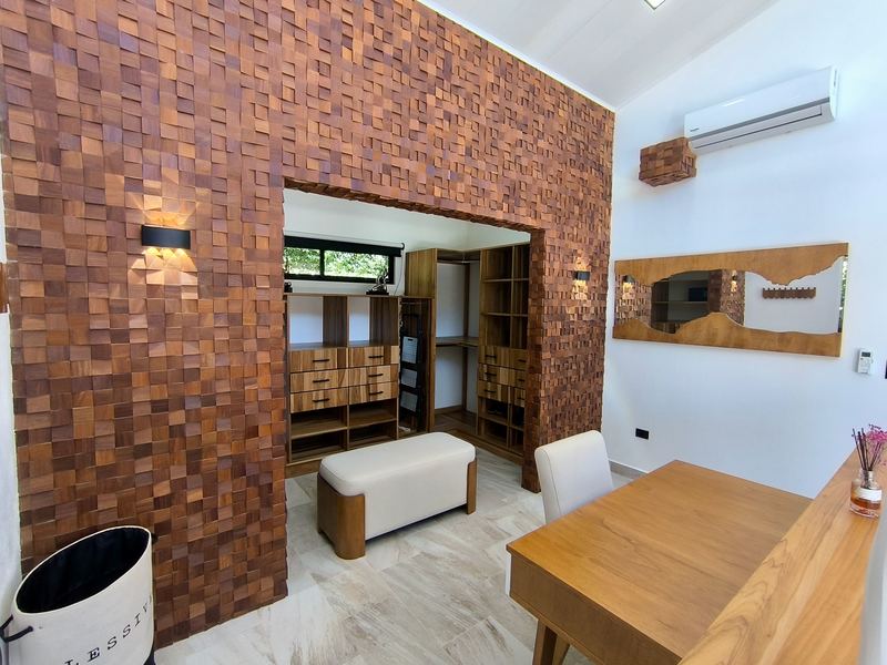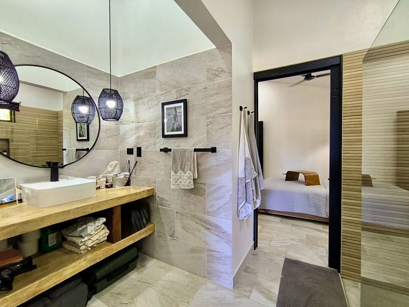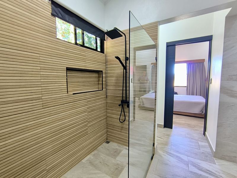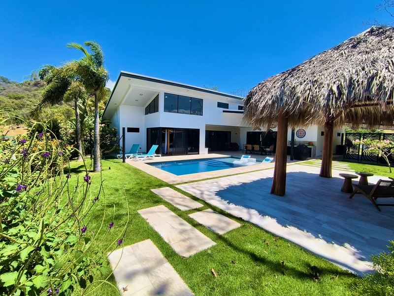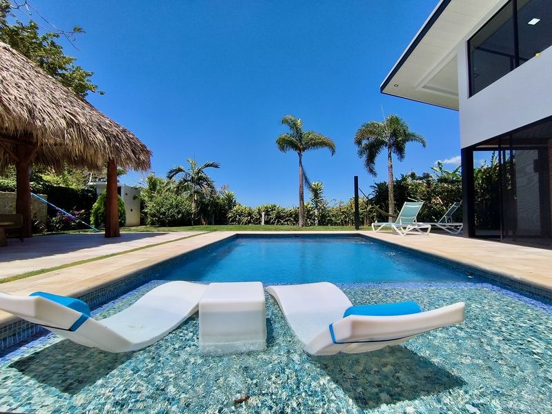 The outdoor living spaces are a true highlight of the property, featuring a covered terrace used as the main dining area, ideal for enjoying the tropical climate. Next to the solar-heated pool, a stunning rancho with an elegant wooden structure, solid wood columns, and a synthetic palm roof creates a refined and inviting space for entertaining.