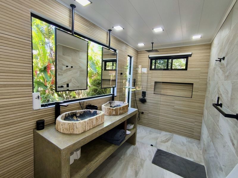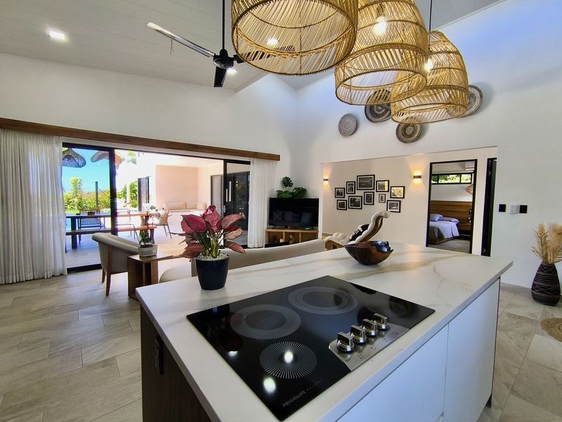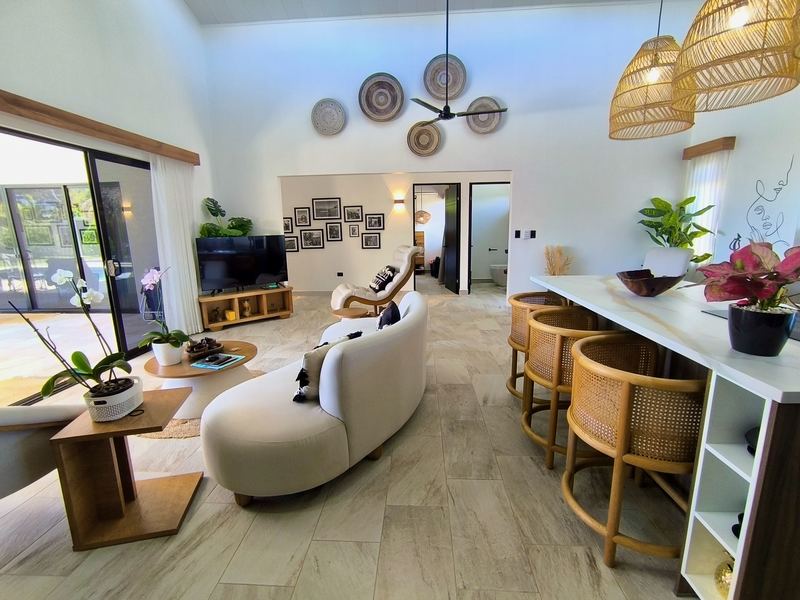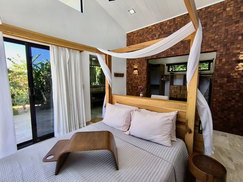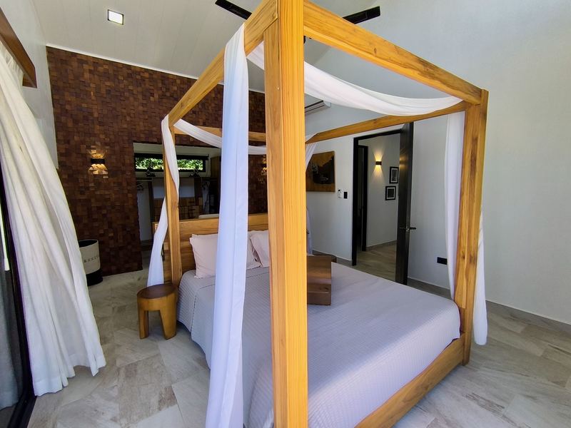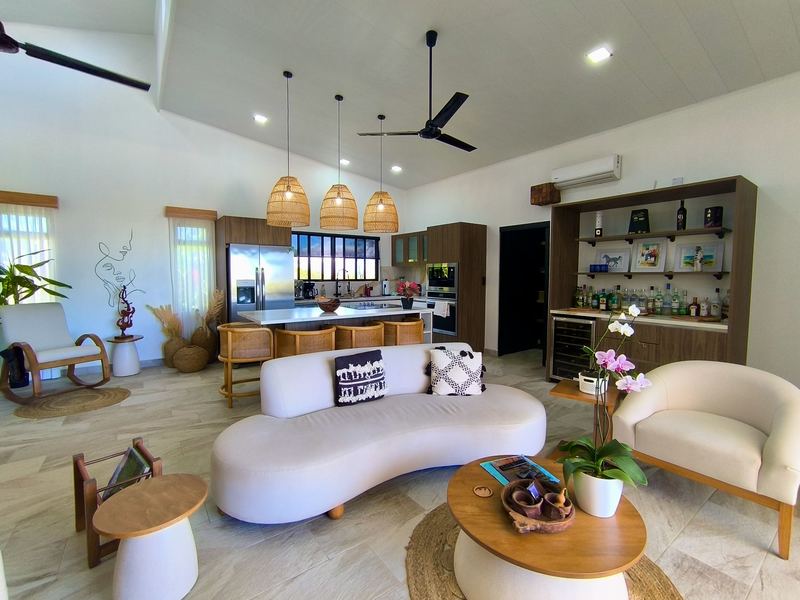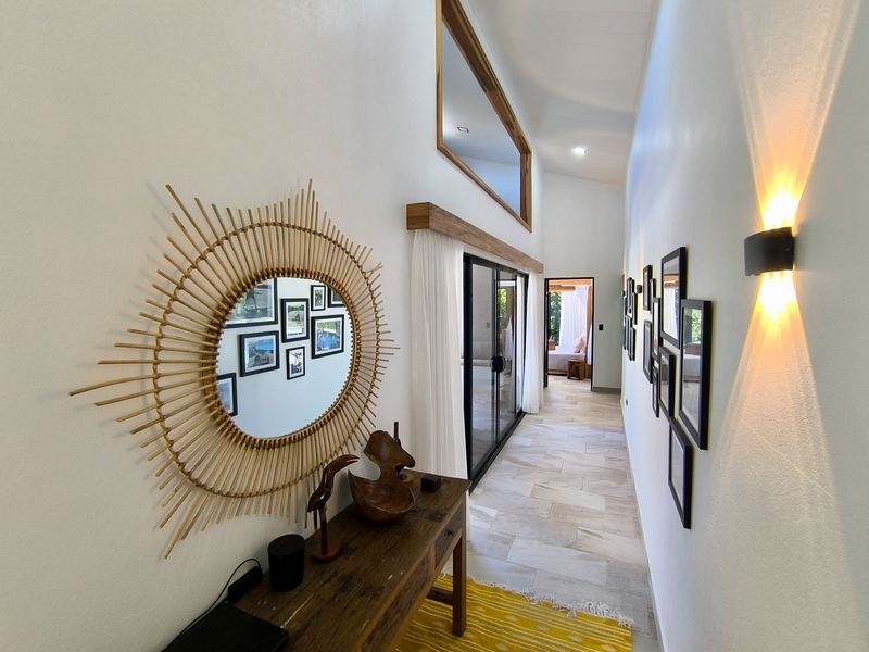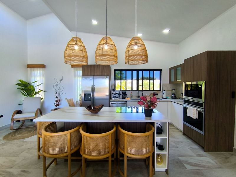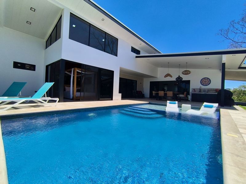 The outdoor living spaces are a true highlight of the property, featuring a covered terrace used as the main dining area, ideal for enjoying the tropical climate. Next to the solar-heated pool, a stunning rancho with an elegant wooden structure, solid wood columns, and a synthetic palm roof creates a refined and inviting space for entertaining.