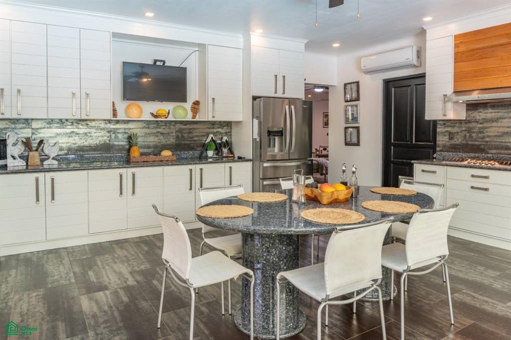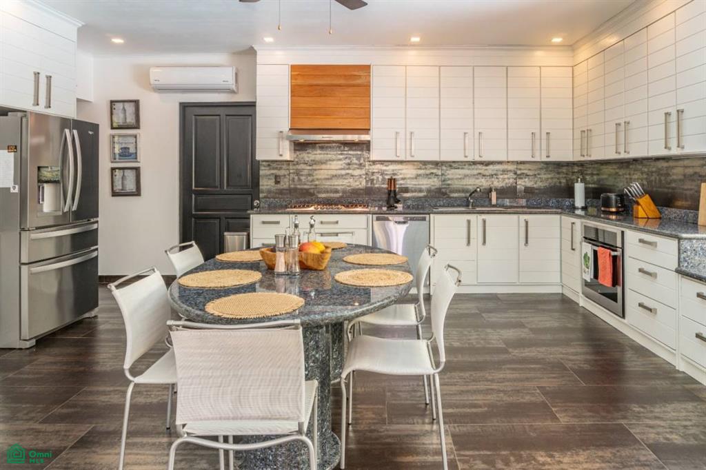 that create a warm and inviting ambiance throughout. The open-concept living and dining area flows into a custom Italian-style kitchen with ample cabinetry, sleek countertops, and direct access to the terrace and pool area.