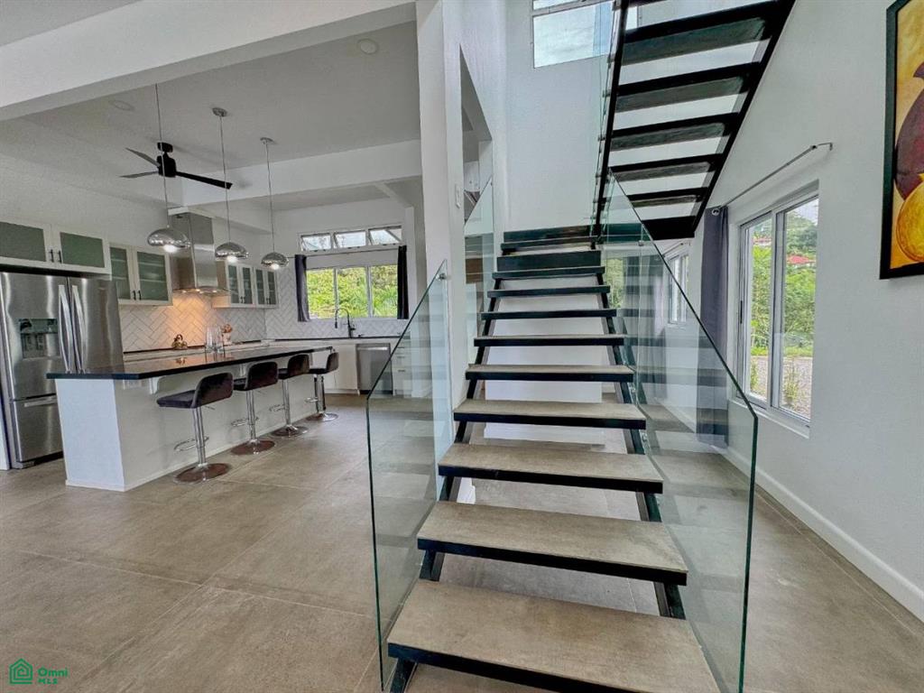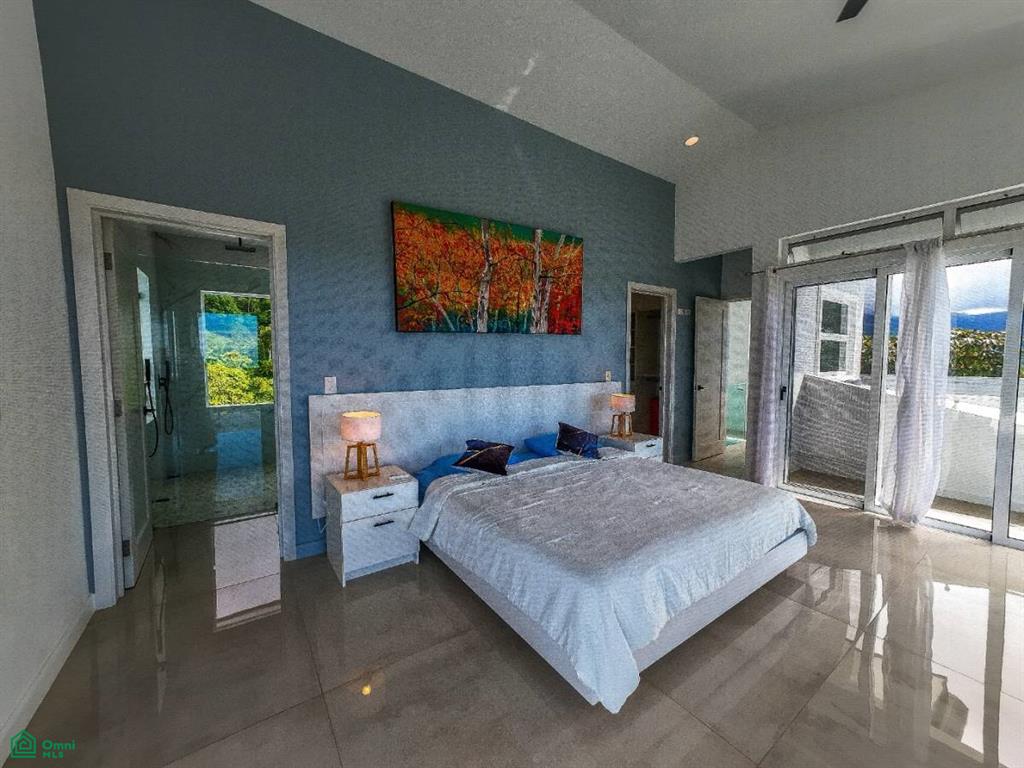 Each of the three master bedrooms is a sanctuary of its own with stunning jungle and ocean views . The upper master bedroom is accessed via a beautiful glass staircase and has a large walk-in closet, ensuite bathroom and wrap-around floor-to-ceiling windows that open up to a private balcony. This is an incredible place to enjoy your morning coffee as you watch the sunrise, or a sunset appointment with a glass of wine or a mojito in hand. For star gazers, this is the perfect spot to view the Milky Way!