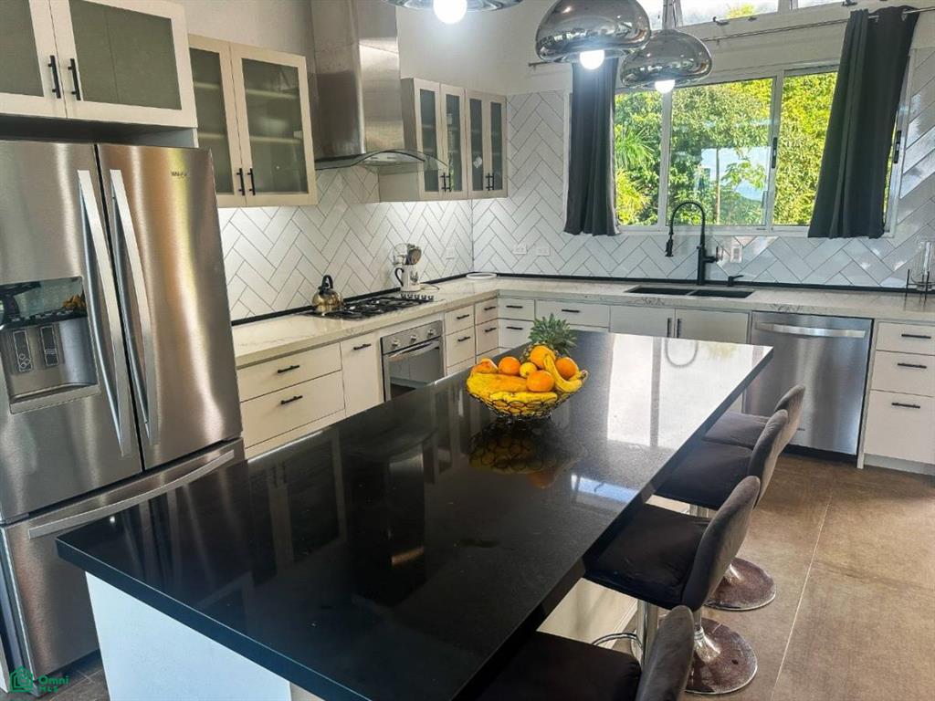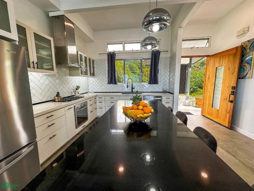 The huge corner-kitchen, at the heart of the home, is a culinary dream with top-of-line appliances, a storage pantry, plenty of cabinets, and a large island with seating that offers both ocean & mountain views. The large, open and airy bathrooms look onto the lush greenery an arm's reach away.
