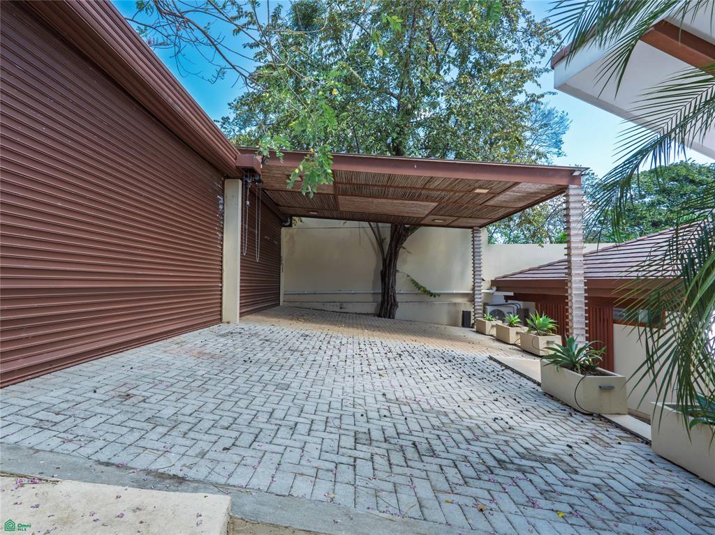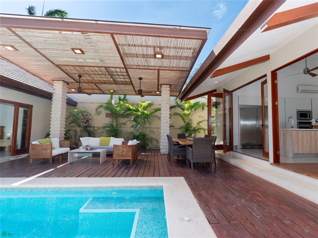 Outdoors, a lush walled garden surrounds a private swimming pool, teak-accented terrace, and outdoor cinema area, ideal for entertaining or unwinding in complete privacy. Floor-to-ceiling wood-framed doors connect the living spaces to the garden, while premium kitchen appliances, an oversized wood entry door, secure two-car parking , and twowater reserve tanks complete the home.