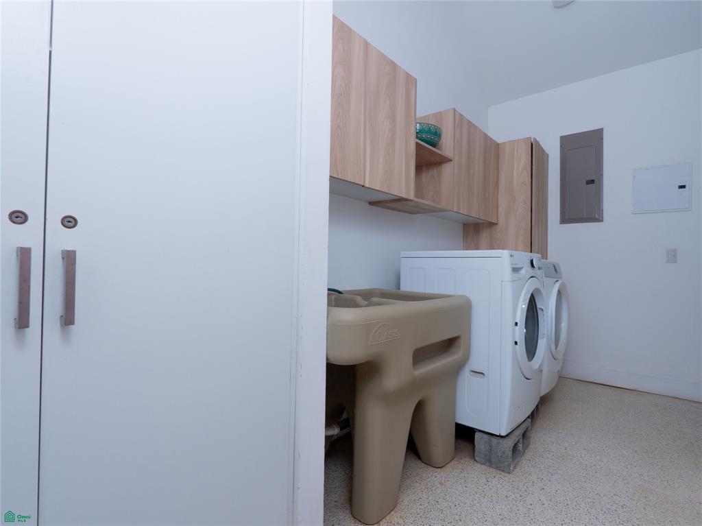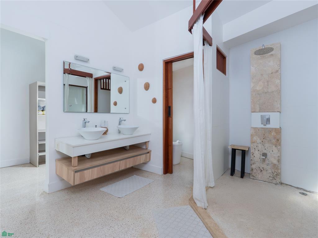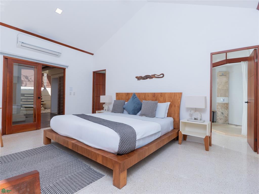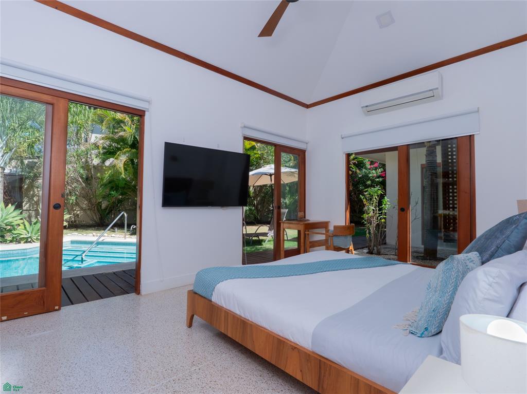 The residence offers three spacious bedrooms and four full bathrooms, each suite designed as a private retreat with en-suite baths and indoor-outdoor showers. The primary suite stands out with a generous walk-in closet and a unique 180-degree rotating TV wall, allowing enjoyment from both bedroom and poolside.
