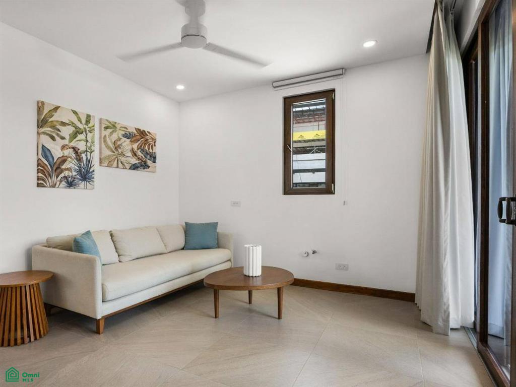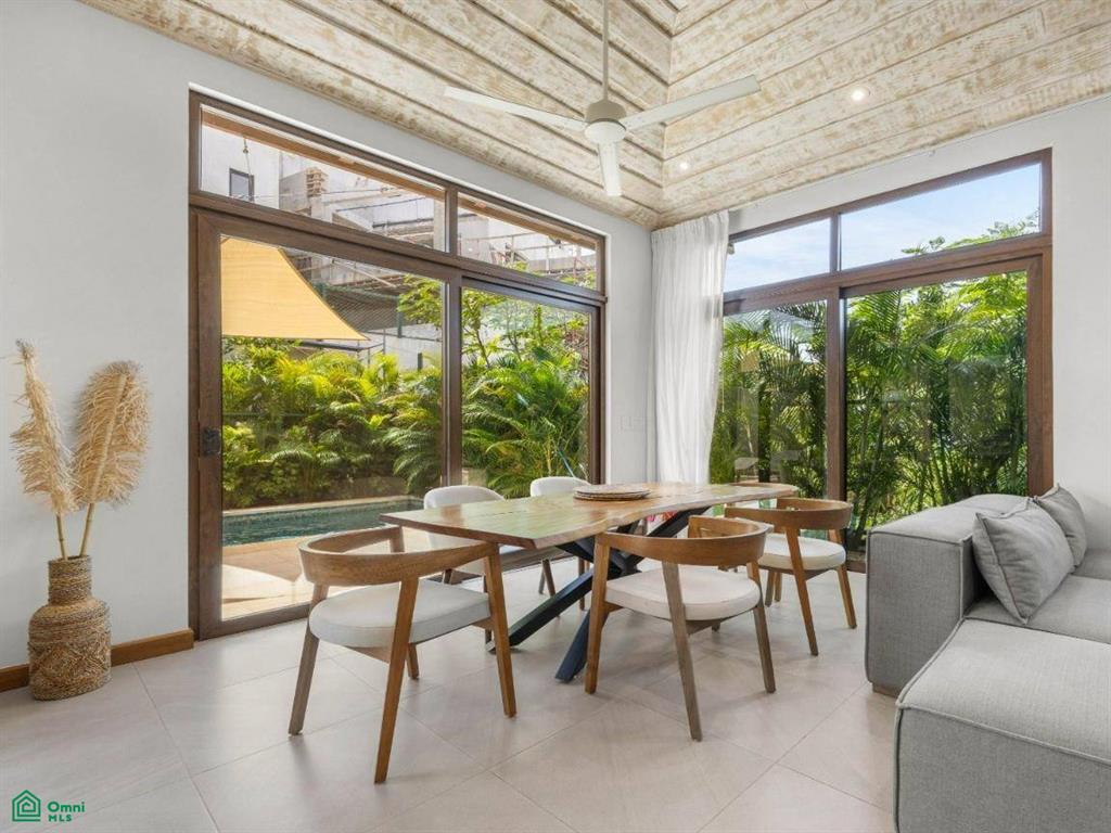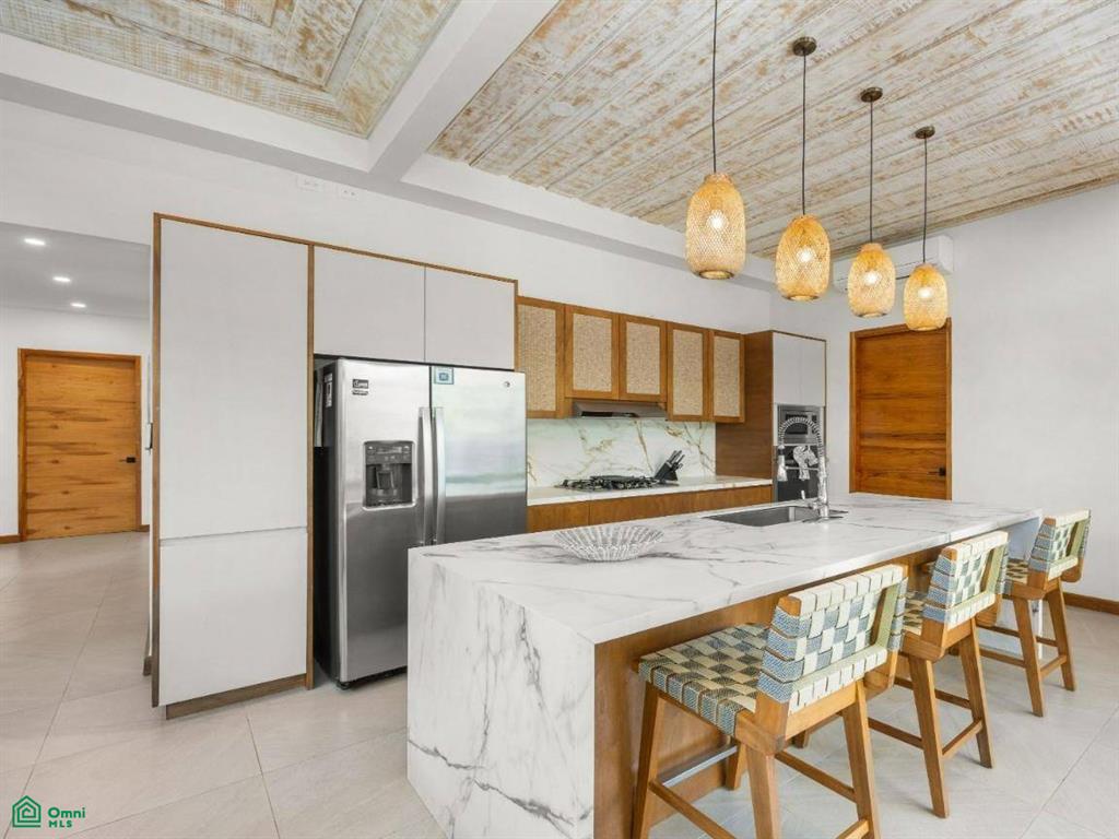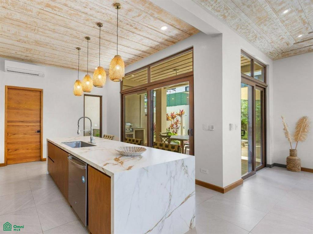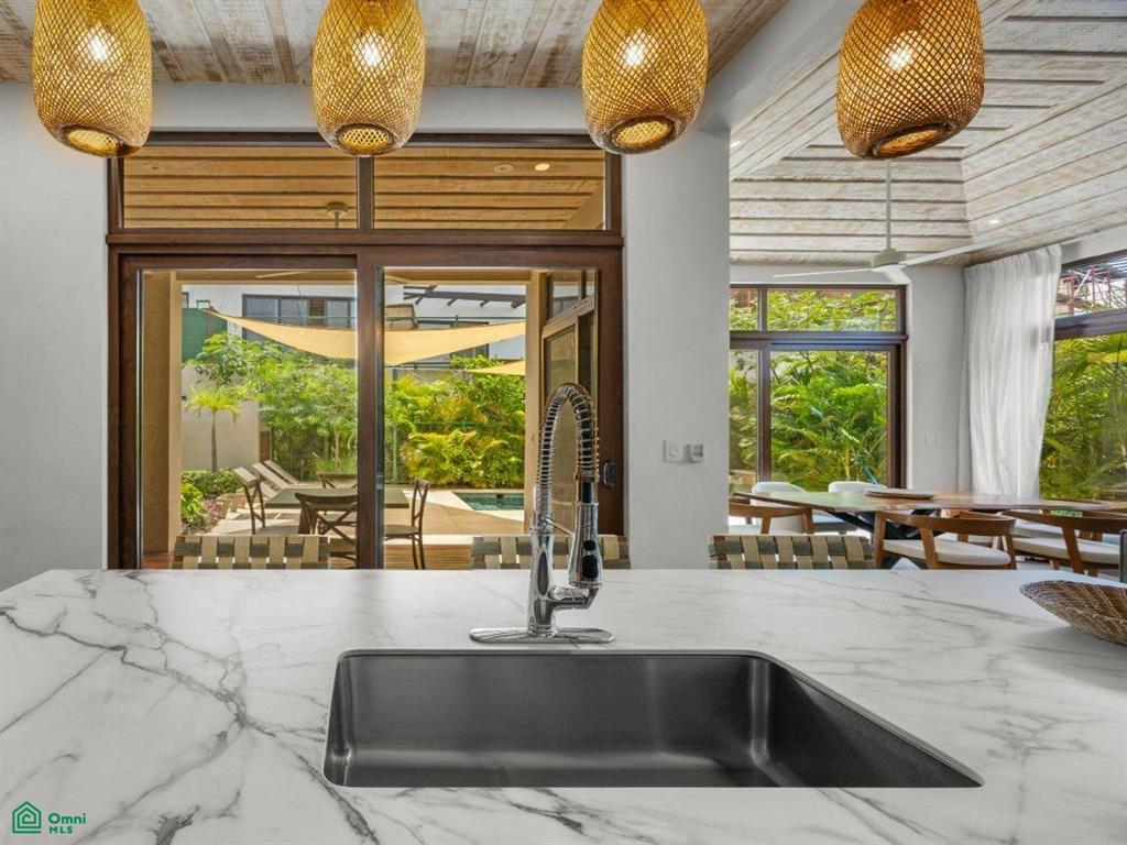 Next to the living area is the sleek, modern kitchen, featuring high-end appliances and custom cabinetry that provides plenty of storage. The island with a breakfast bar adds both functionality and a social aspect, making it a great spot for casual meals and conversations. Adjacent to the kitchen is a spacious patio that extends from the home, complete with a covered terrace that’s perfect for outdoor dining or relaxing while taking in the tropical surroundings.