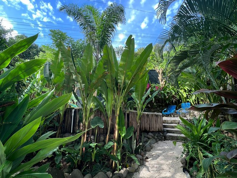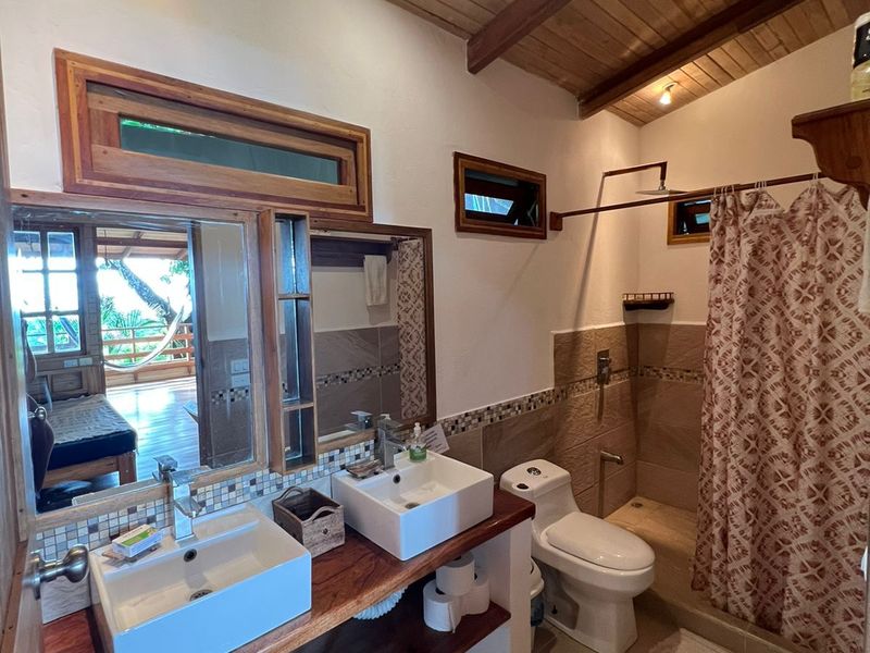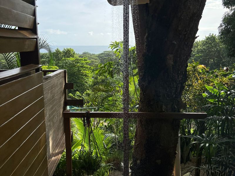 Lush tropical landscaping and an outdoor shower enhance the experience, offering privacy and connection to nature.