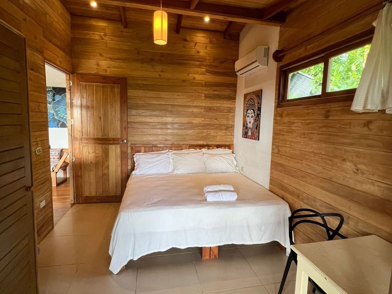 The primary bedroom enjoys ocean views, a convertible king-size bed, direct deck access, air conditioning, and ample storage.