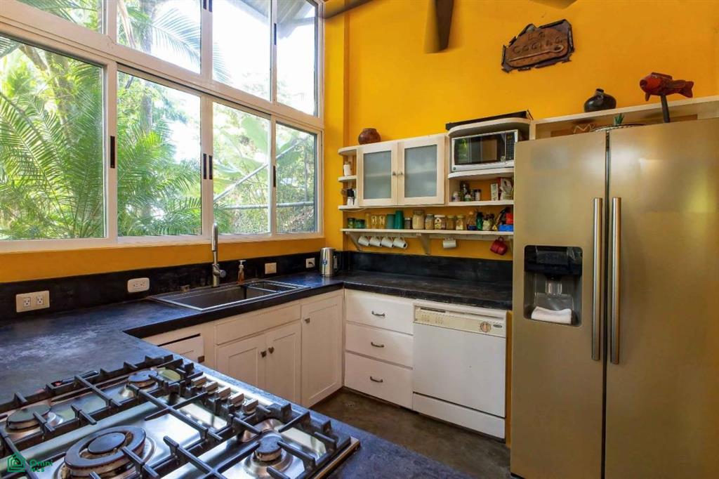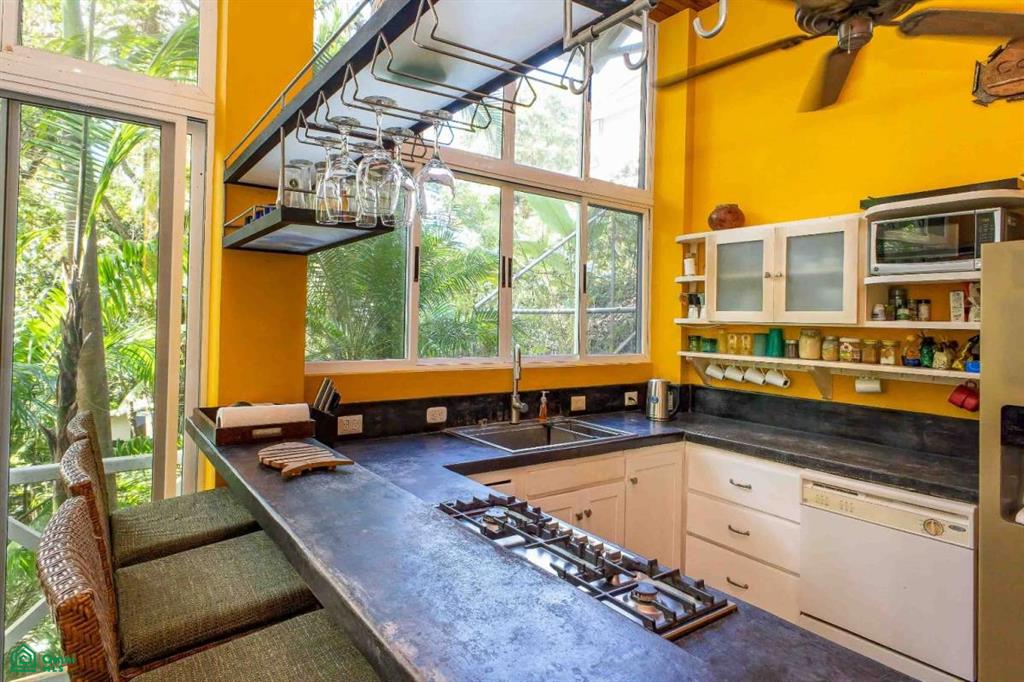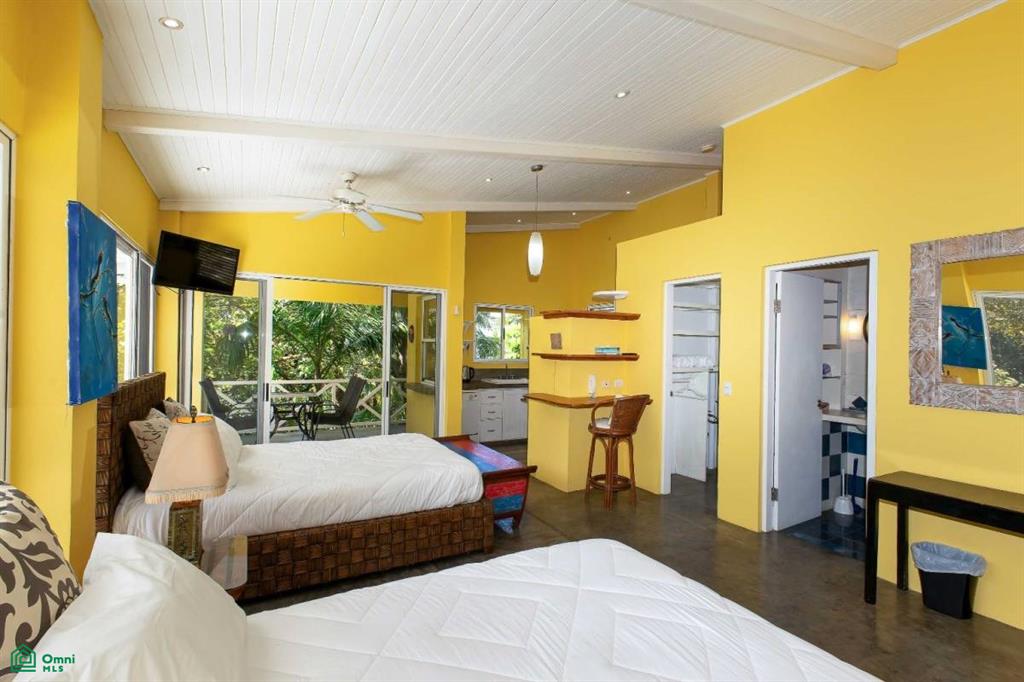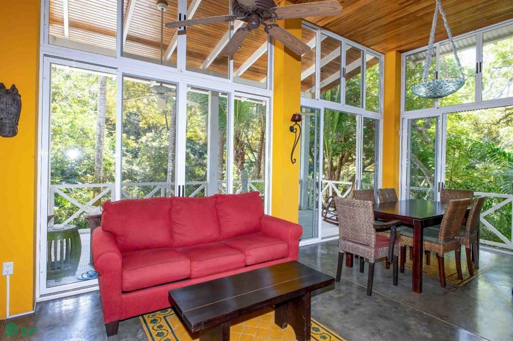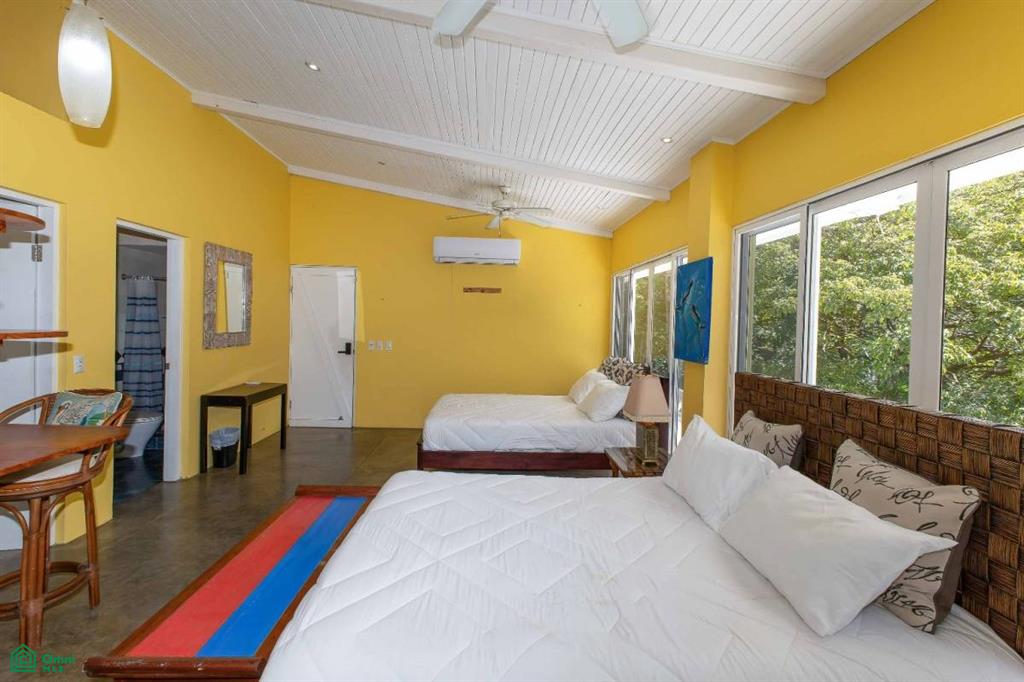 The main level features a one-bedroom apartment with a full kitchen, bathroom, and private balcony. Sliding glass doors allow the space to open fully to jungle breezes and the soothing sounds of the seasonal creek below, while air conditioning provides comfort year-round.