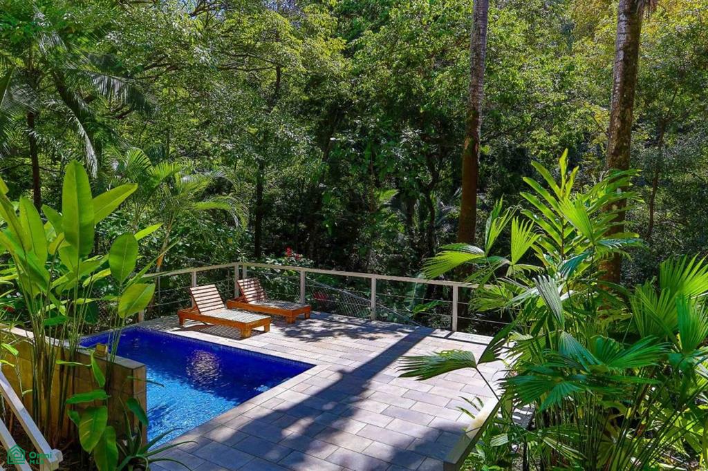 The pool and entertainment area is located on the lowest level, accessed via an internal open-air stairway. Elevated above the ground and surrounded by mature trees, the tiled pool deck offers a private jungle setting ideal for relaxation or entertaining. From this level, the property overlooks a seasonal creek, enhancing the sense of tranquility and connection to nature.