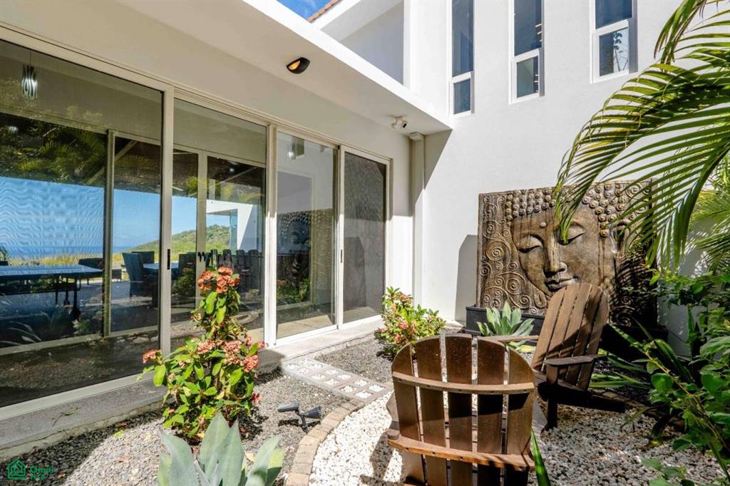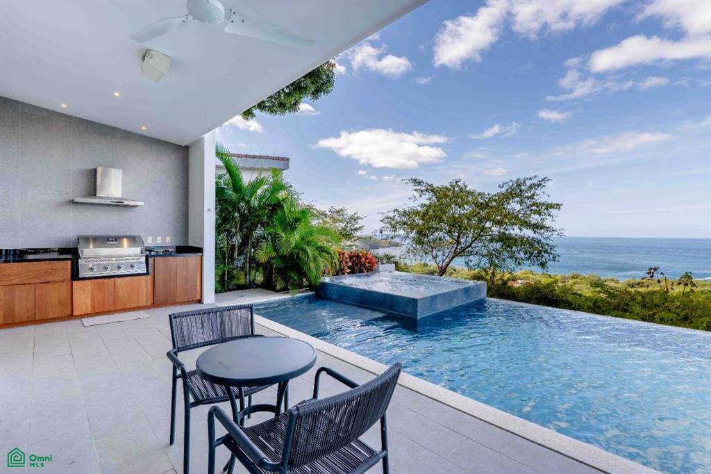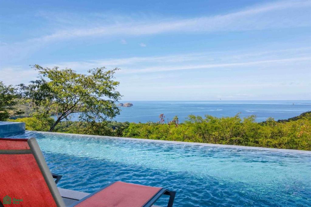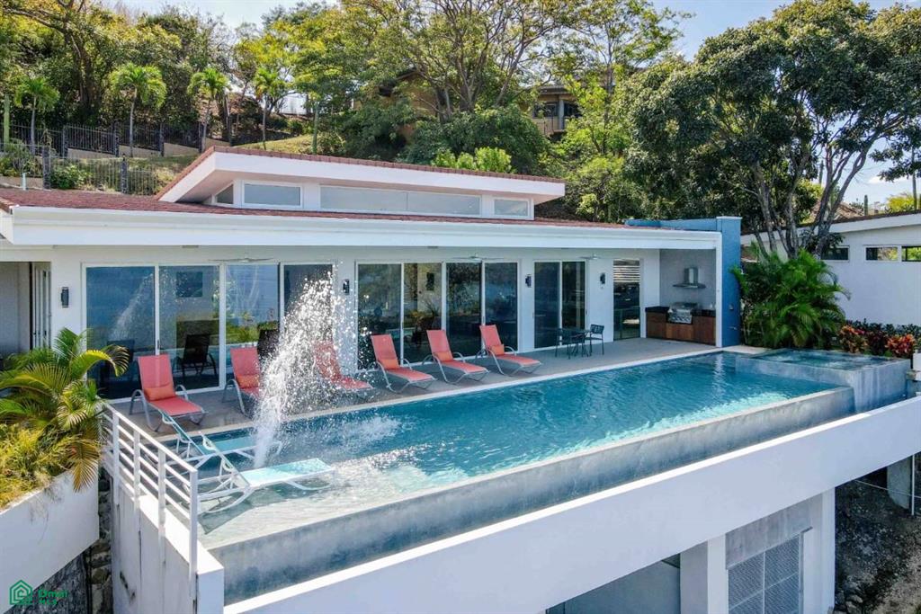 Where the lush canopy of the jungle meets the endless expansive views of the Pacific Ocean and the Papagayo Marina, this four-bedroom, all-suite sanctuary offers a lifestyle of coastal luxury. Spanning 8,300 square feet of total construction—with 5,000 square feet of air-conditioned living space—this villa is a masterclass in design, balancing high-end features with smart home technology and the beauty of its natural surroundings. The heart of the home is a chef’s dream, featuring an expansive interior kitchen equipped with modern appliances and generous quartz counter space that transitions effortlessly into a formal dining room seating eight. The living area, bathed in golden light, is intentionally designed for both grand entertaining and quiet relaxation, providing a front-row seat to the daily spectacle of the sun melting into the ocean horizon. Every sleeping quarter is a private haven. Three suites feature king-sized beds, with two offering the ultimate indulgence: deep soaker tubs positioned to provide immersive ocean and jungle views. A fourth suite provides two queen-sized beds, ensuring ample room for guests or family. Thoughtfully crafted for all, the main-floor bedrooms are entirely barrier-free, ensuring that those with mobility concerns can enjoy the home’s elegance without compromise. The property truly shines outdoors, where the architecture embraces the tropical climate. A complete exterior kitchen and dedicated BBQ area allow for seamless alfresco entertaining on the terrace. The centerpiece of the estate is an extraordinary 65-foot swimming pool with a cascading water fountain, complemented by a separate 10-person jetted pool. For moments of deep reflection, a manicured Zen garden offers a peaceful escape, while the expansive grounds provide additional space to build a casita, perfect for a private guest house or studio. Security and convenience are woven into the fabric of this community. Situated within a gated and guarded community, re
