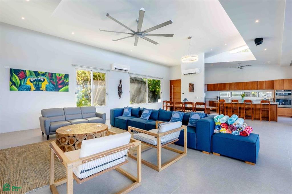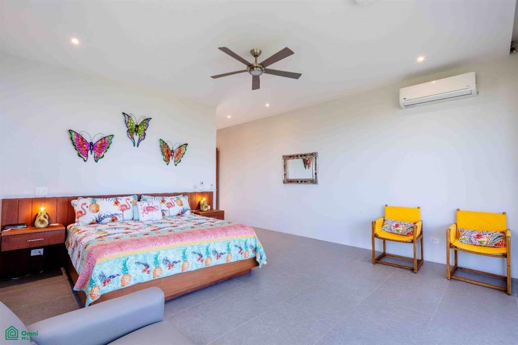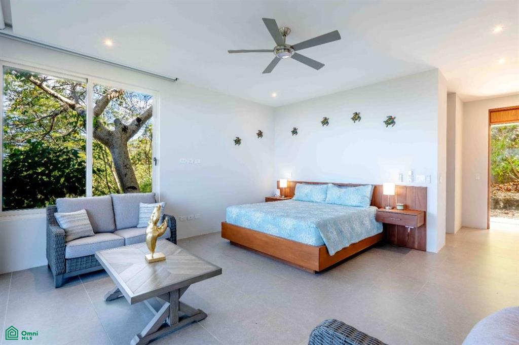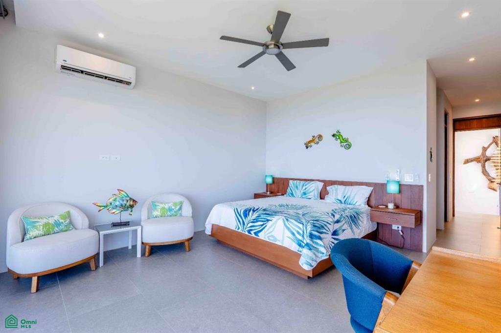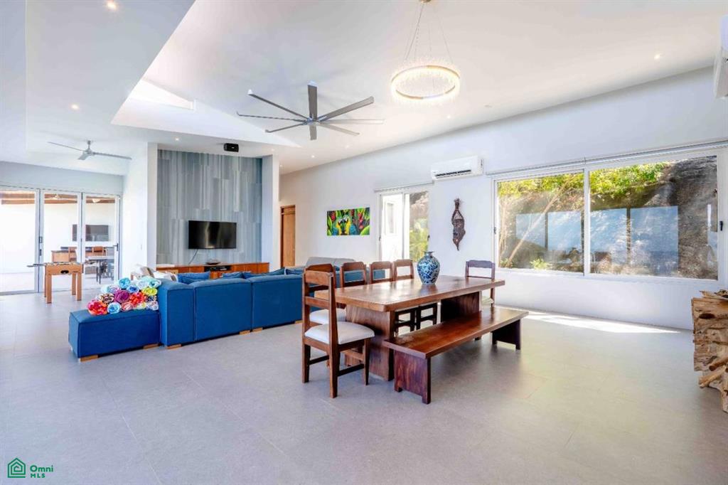 Where the lush canopy of the jungle meets the endless expansive views of the Pacific Ocean and the Papagayo Marina, this four-bedroom, all-suite sanctuary offers a lifestyle of coastal luxury. Spanning 8,300 square feet of total construction—with 5,000 square feet of air-conditioned living space—this villa is a masterclass in design, balancing high-end features with smart home technology and the beauty of its natural surroundings. The heart of the home is a chef’s dream, featuring an expansive interior kitchen equipped with modern appliances and generous quartz counter space that transitions effortlessly into a formal dining room seating eight. The living area, bathed in golden light, is intentionally designed for both grand entertaining and quiet relaxation, providing a front-row seat to the daily spectacle of the sun melting into the ocean horizon. Every sleeping quarter is a private haven. Three suites feature king-sized beds, with two offering the ultimate indulgence: deep soaker tubs positioned to provide immersive ocean and jungle views. A fourth suite provides two queen-sized beds, ensuring ample room for guests or family. Thoughtfully crafted for all, the main-floor bedrooms are entirely barrier-free, ensuring that those with mobility concerns can enjoy the home’s elegance without compromise. The property truly shines outdoors, where the architecture embraces the tropical climate. A complete exterior kitchen and dedicated BBQ area allow for seamless alfresco entertaining on the terrace. The centerpiece of the estate is an extraordinary 65-foot swimming pool with a cascading water fountain, complemented by a separate 10-person jetted pool. For moments of deep reflection, a manicured Zen garden offers a peaceful escape, while the expansive grounds provide additional space to build a casita, perfect for a private guest house or studio. Security and convenience are woven into the fabric of this community. Situated within a gated and guarded community, re