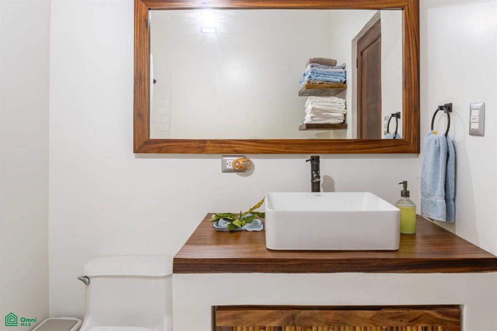The primary suite offers a peaceful retreat with jungle-facing windows and French doors opening to an ocean-view terrace. The renovated bathroom features marble floors and new plumbing fixtures, creating a spa-like atmosphere.