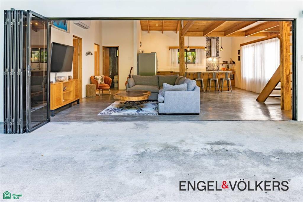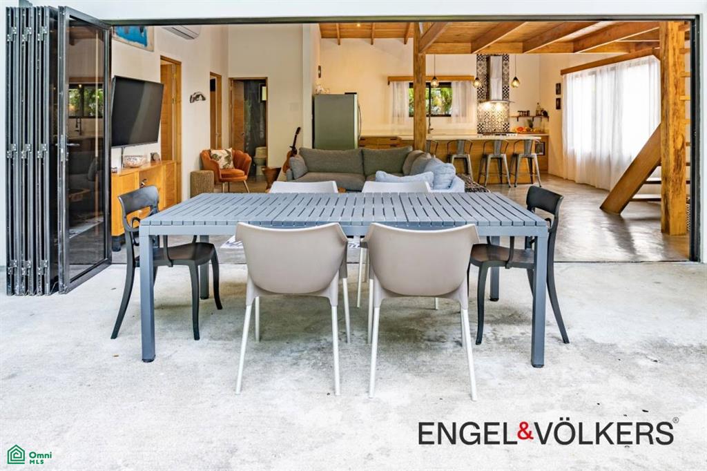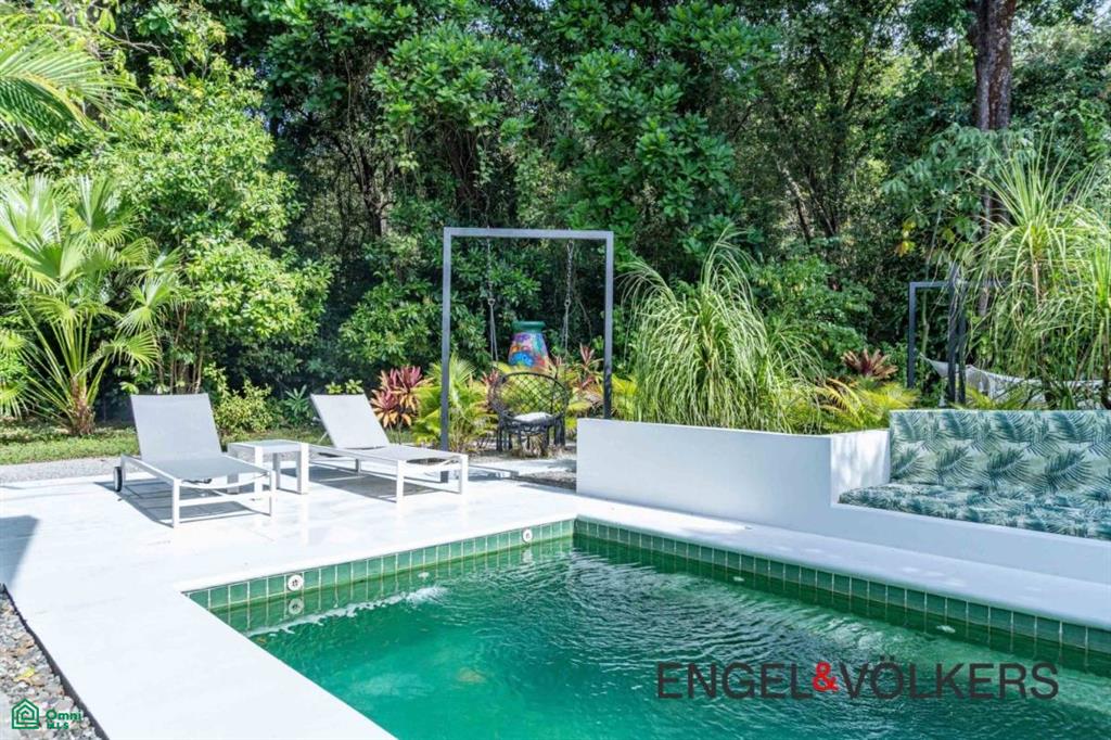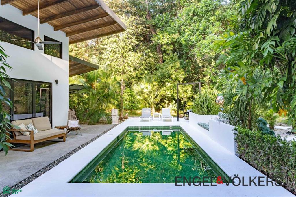 Surrounded by lush tropical gardens, the estate feels like a private retreat. A winding path leads to hanging swings, a large lap pool, multiple seating areas, a barbecue space, and a firepit. The property borders a peaceful river with no future neighbors and abundant wildlife, including daily howler monkey visits and colorful birds.