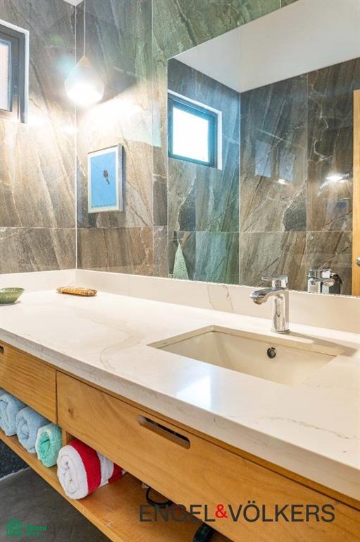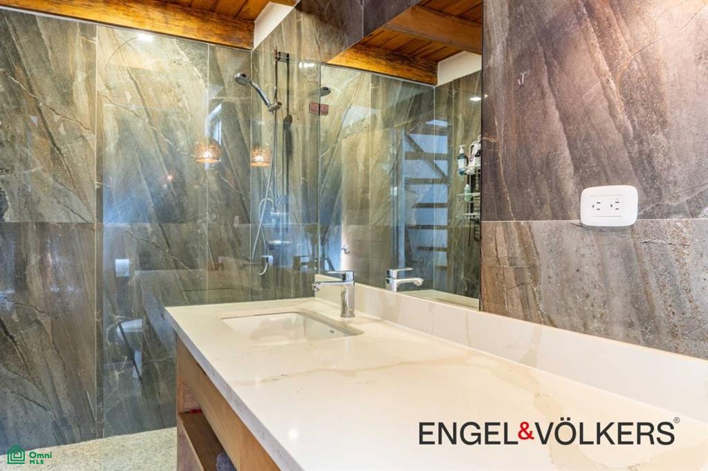 Two ensuite bedrooms feature king beds, custom closets, and elegant bathrooms with quartz countertops, glass showers, and modern tile finishes. One opens directly onto the pool area, while the other overlooks the gardens. A cozy loft provides an additional sleeping space with a full-size bed.