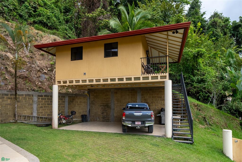 Its upper level is designed for living, while the lower level functions as a covered parking area for two vehicles.