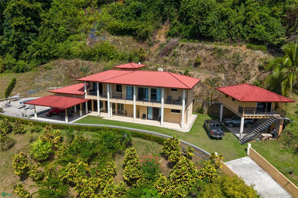 The property offers a main two-story house, a separate guest house, a swimming pool, and full asphalt road access all the way to the home.